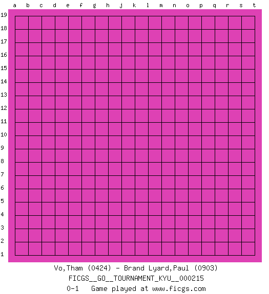 Last move : 0-1 2023 November 20 5:18:46 [Event "FICGS__GO__TOURNAMENT_KYU__000215"] [Site "FICGS"] [Date "2023.10.21"] [Round "1"] [Black "Vo,Tham"] [White "Brand Lyard,Paul"] [Result "0-1"] [Rating 1 "0424"] [Rating 2 "0903"] 0-1 This go game has been lost on time (started : 2023.10.21 0:24:46) Follow this game move after move (download)If a formation is symmetrical, play at the center. (Anonymous) Imagination is more important than knowledge. Knowledge is limited. Imagination encircles the world. (Albert Einstein)