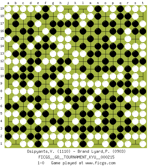 Last move : 1-0 2023 December 29 20:54:35 [Event "FICGS__GO__TOURNAMENT_KYU__000215"] [Site "FICGS"] [Date "2023.10.21"] [Round "1"] [Black "Osipyants,Vladimir"] [White "Brand Lyard,Paul"] [Result "1-0"] [Rating 1 "1110"] [Rating 2 "0903"] 1.q16 g7 2.d4 e4 3.e3 d3 4.c3 c4 5.d5 d6 6.d2 r16 7.r17 q17 8.p17 n17 9.o17 o16 10.p16 p15 11.o15 n15 12.n16 m16 13.d16 o16 14.o14 o13 15.n14 m14 16.n16 l15 17.m15 l17 18.m13 k13 19.l14 h7 20.k15 j15 21.l16 j16 22.m17 m18 23.n18 l10 24.q3 p3 25.p4 p5 26.o4 n4 27.o5 o6 28.n6 m6 29.o3 o2 30.n3 m4 31.m3 l3 32.n7 m7 33.h4 k5 34.j3 q8 35.p6 p8 36.p7 o7 37.o8 o10 38.p9 p10 39.q9 q10 40.r9 o9 41.r8 n9 42.c14 t6 43.d10 r7 44.q7 h10 45.e6 f6 46.e7 s5 47.s3 r2 48.r3 n5 49.l4 k4 50.m5 k8 51.g17 e17 52.d17 r12 53.q14 r5 54.r6 q8 55.k17 s11 56.s13 g12 57.f10 n12 58.m12 l7 59.k3 d9 60.e9 f9 61.f8 g9 62.e12 m9 63.n11 k10 64.g10 o7 65.g8 k12 66.f14 n4 67.h8 k9 68.j8 q4 69.p2 p12 70.o11 j6 71.j7 j11 72.h9 h5 73.g4 s10 74.f5 n8 75.o6 q6 76.q5 l6 77.k7 h6 78.k6 g13 79.g14 h14 80.g16 q13 81.p14 m11 82.o12 j4 83.l5 f12 84.e13 h13 85.l8 g9 86.h11 n2 87.l2 c12 88.c11 e15 89.d15 k2 90.r10 s9 91.s8 s7 92.t8 d8 93.d7 g3 94.p13 g2 95.p11 q11 96.n13 l13 97.r13 j14 98.h12 q1 99.q2 h18 100.j17 s18 101.s17 k19 102.l11 g19 103.f18 r15 104.q18 p19 105.j12 t15 106.m10 t13 107.s12 j10 108.g11 c19 109.b17 b16 110.c16 e11 111.d11 t4 112.t3 j2 113.h3 c10 114.b10 m1 115.l1 b8 116.c9 j1 117.f3 h15 118.h17 f1 119.e1 c6 120.c7 b5 121.b6 l9 122.m8 t1 123.pass b2 124.b3 m7 125.l7 c1 126.j5 d14 127.c13 a13 128.b15 m6 129.pass e19 130.e18 h1 131.pass s4 132.pass k4 133.pass o1 134.pass f16 135.e14 b12 136.d12 b14 137.a16 r1 138.r4 b7 139.c5 e5 140.pass t2 141.p1 b11 142.pass f2 143.s1 t11 144.t12 c8 145.q12 m2 146.pass b4 147.pass t7 148.pass s14 149.s16 c18 150.pass b9 151.c10 l18 152.pass j18 153.k18 d6 154.pass m19 155.n19 a18 156.b18 g15 157.f15 r19 158.pass t17 159.r11 t9 160.pass p18 161.q19 g6 162.pass a1 163.a3 a8 164.pass t5 165.pass t19 166.t16 a5 167.a6 a12 168.a10 a15 169.pass h2 170.pass d1 171.e2 b19 172.pass h19 173.pass o19 174.pass pass 175.pass k1 176.l3 s19 177.r18 s2 178.pass t14 179.pass c2 180.a2 pass 181.pass r14 182.pass a19 183.b13 n5 184.pass d19 185.f19 1-0 Follow this game move after move (download)Go is to western chess what philosophy is to double entry accounting. (from Shibumi, by Trevanian) Real knowledge is to know the extent of one's ignorance. (Confucius)