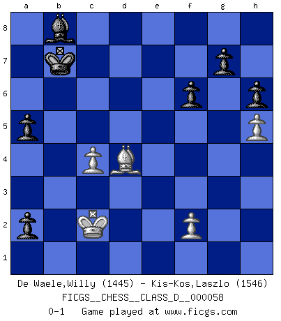 Last move : 0-1 2007 November 27 21:36:35 [Event "FICGS__CHESS__CLASS_D__000058"] [Site "FICGS"] [Date "2007.09.10"] [Round "1"] [White "De Waele,Willy"] [Black "Kis-Kos,Laszlo"] [Result "0-1"] [WhiteElo "1445"] [BlackElo "1546"] 1.e4 e5 2.Nf3 Nc6 3.Bb5 a6 4.Ba4 Nf6 5.O-O Nxe4 6.d4 b5 7.Bb3 d5 8.dxe5 Be6 9.Nbd2 Be7 10.c3 O-O 11.Qe2 Nc5 12.Nd4 Nxb3 13.N2xb3 Qd7 14.Nxc6 Qxc6 15.Be3 Bf5 16.Rfd1 Qg6 17.Nd4 Bd7 18.Qd3 Qh5 19.b4 Qxe5 20.Nf3 Qh5 21.Qxd5 Qxd5 22.Rxd5 Bc6 23.R5d1 Bxf3 24.gxf3 Rfd8 25.a4 Rxd1+ 26.Rxd1 bxa4 27.Ra1 Bf6 28.Ra3 a5 29.b5 Rd8 30.c4 Rd1+ 31.Kg2 Ra1 32.Rxa1 Bxa1 33.Bf4 Bd4 34.Bxc7 a3 35.b6 a2 36.b7 Ba7 37.Be5 f6 38.Bd4 Bb8 39.h3 Kf7 40.h4 Ke6 41.h5 h6 42.f4 Bxf4 43.Kf3 Bb8 44.Ke2 Kd7 45.Kd2 Kc6 46.Kc2 Kxb7 0-1 Ruy Lopez : Open, 7.Bb3 Kingside Castling by player White (move 5) Kingside Castling by player Black (move 10) Player Black won this chess game. Follow this game move after move (download)If one piece is badly posted, the whole game is bad. (Tarrasch) Frage: Was machen Sie mit den Preisen? Anwort: Ich habe Angst, dass meine Freundin davon neue Kleider kauft. (Loek van Wely) Bobby es el jugador de Ajedrez mas fino que este paÃs jamás haya producido. Su memoria para las movidas, su brillantez en soñar combinaciones y su feróz determinación por la victoria son algo extraño. (John Collins) 'L'échange des dames est un coup dur pour les deux adversaires...' Un journaliste lors d'une partie du match Spassky-Fischer Empty your mind, be formless, shapeless — like water. (Bruce Lee)