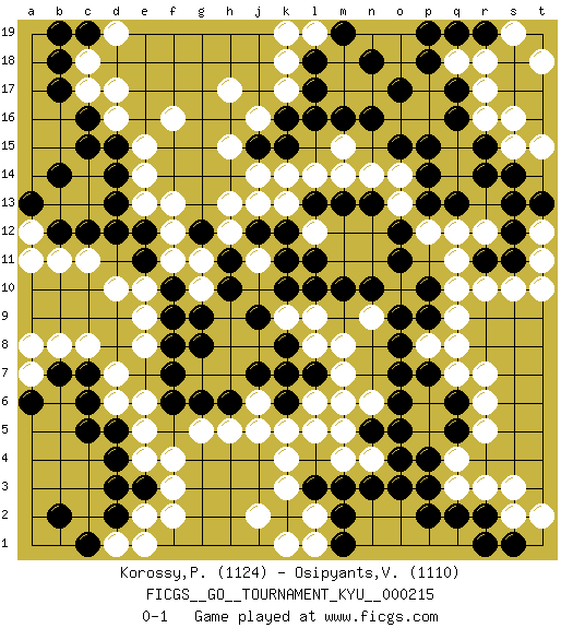 Last move : 0-1 2024 February 10 9:0:26 [Event "FICGS__GO__TOURNAMENT_KYU__000215"] [Site "FICGS"] [Date "2023.10.21"] [Round "1"] [Black "Korossy,Peter"] [White "Osipyants,Vladimir"] [Result "0-1"] [Rating 1 "1124"] [Rating 2 "1110"] 1.q16 q4 2.d4 d17 3.c15 f16 4.b17 c18 5.b18 j16 6.l17 k17 7.l16 r6 8.o3 m4 9.o5 m6 10.q2 r3 11.r2 s2 12.s1 s3 13.m2 k3 14.l3 k4 15.k2 j2 16.m3 n4 17.o4 k1 18.o7 q9 19.o9 f4 20.c6 d10 21.d12 c11 22.c12 c8 23.e3 f3 24.r11 r10 25.r14 r17 26.q17 r16 27.r15 q18 28.p18 r18 29.o17 s15 30.s14 s16 31.p15 q11 32.s11 s10 33.p10 q10 34.j9 m8 35.m10 j13 36.k12 k13 37.l13 l14 38.m13 m14 39.n13 n14 40.j12 h13 41.k15 k14 42.j15 h15 43.f10 e8 44.f6 d6 45.c5 e5 46.g8 h5 47.k6 l5 48.l7 m7 49.h6 g5 50.g6 e14 51.d13 b11 52.b12 o13 53.o12 p12 54.o11 t11 55.s12 t12 56.t13 t10 57.p13 r12 58.s13 o14 59.q13 q12 60.p14 p8 61.o8 k18 62.l18 e2 63.d2 e4 64.d3 f2 65.b7 b8 66.c7 d7 67.g12 h12 68.h11 l12 69.l11 j11 70.k11 g11 71.h10 f12 72.e11 g10 73.g9 f11 74.e12 f13 75.b19 c17 76.c16 d16 77.n16 l19 78.m19 k19 79.n18 l2 80.n3 l8 81.k8 l9 82.p7 q7 83.k16 h17 84.d15 e15 85.d14 d1 86.c1 e1 87.b2 e10 88.f9 j5 89.n5 m5 90.q5 r5 91.q6 r7 92.p9 q8 93.p4 q3 94.p2 n6 95.o6 j6 96.j7 l6 97.k7 k9 98.k10 n9 99.n10 a12 100.a13 a11 101.b14 j14 102.m1 l1 103.c19 d19 104.f7 e9 105.o15 m15 106.m16 a7 107.a6 a8 108.d5 e6 109.q19 t18 110.r19 s19 111.p19 t15 112.r1 t2 113.l10 k5 114.f8 pass 115.p3 e13 0-1 Follow this game move after move (download)Don't be greedy ! (Anonymous) Without deviation from the norm, progress is not possible. (Frank Zappa)