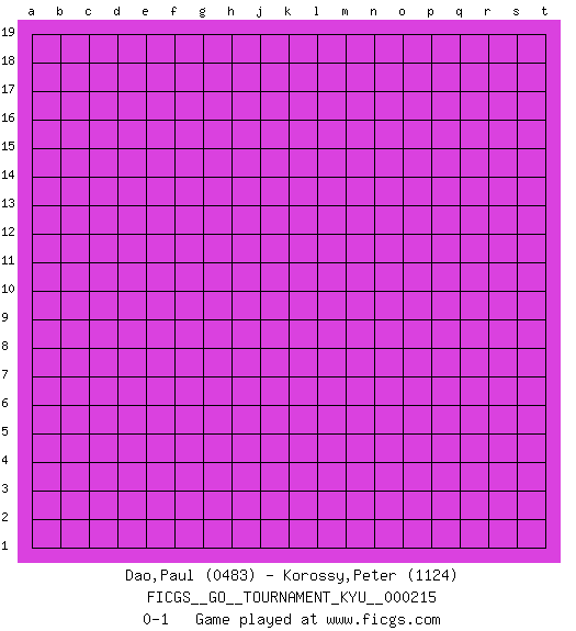 Last move : 0-1 2023 November 20 5:18:46 [Event "FICGS__GO__TOURNAMENT_KYU__000215"] [Site "FICGS"] [Date "2023.10.21"] [Round "1"] [Black "Dao,Paul"] [White "Korossy,Peter"] [Result "0-1"] [Rating 1 "0483"] [Rating 2 "1124"] 0-1 This go game has been lost on time (started : 2023.10.21 0:24:46) Follow this game move after move (download)Keep inessential ataris till the end. (Anonymous) Always remember that you are unique; just like everyone else. (Unknown)