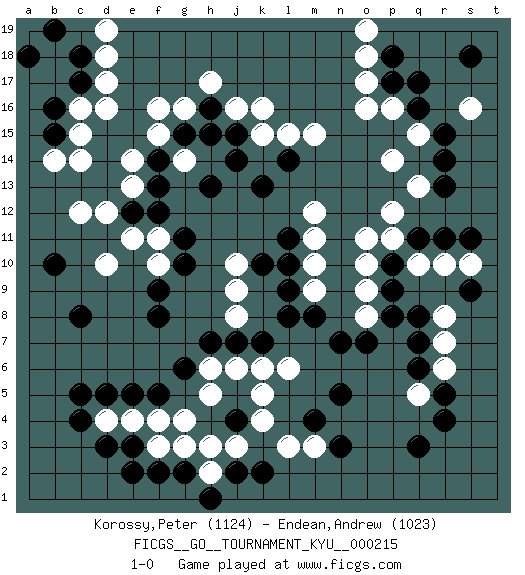 Last move : 1-0 2024 February 14 23:20:6 [Event "FICGS__GO__TOURNAMENT_KYU__000215"] [Site "FICGS"] [Date "2023.10.21"] [Round "1"] [Black "Korossy,Peter"] [White "Endean,Andrew"] [Result "1-0"] [Rating 1 "1124"] [Rating 2 "1023"] 1.q16 d16 2.c4 e4 3.e3 d4 4.d3 g4 5.c5 k4 6.c8 d10 7.q3 q5 8.r5 r6 9.r4 r8 10.n3 m3 11.r11 k16 12.k10 o17 13.p17 o16 14.r14 q10 15.k13 c14 16.n5 l6 17.n7 j8 18.l8 j10 19.f8 p14 20.q11 r10 21.q7 r7 22.q6 p11 23.p10 o11 24.p9 o10 25.q8 o9 26.p8 o8 27.o7 p12 28.s11 s10 29.s9 q15 30.r15 p16 31.q17 o18 32.p18 o19 33.k7 k6 34.j7 j9 35.m8 m12 36.l11 m11 37.l10 m10 38.l9 m9 39.g11 f11 40.g10 f10 41.h13 g14 42.c17 d17 43.c18 d18 44.b15 c15 45.b16 c16 46.a18 b14 47.b19 d19 48.g6 h5 49.g2 f3 50.f2 g3 51.j2 h3 52.k2 l3 53.b10 c12 54.l14 m15 55.j15 j16 56.h15 g16 57.h16 h17 58.g15 f16 59.f14 f15 60.f13 e14 61.e12 e13 62.f12 d12 63.f9 e11 64.f5 f4 65.d5 j6 66.h7 h6 67.e5 h2 68.h1 j3 69.e2 k5 70.j4 k15 71.j14 q13 72.r13 s16 73.s18 l15 74.m4 1-0 Follow this game move after move (download)You can hide nothing on the goban. (Pierre Audouard) Memory is a way of holding onto the things you love, the things you are, the things you never want to lose. (from the television show: The Wonder Years)
