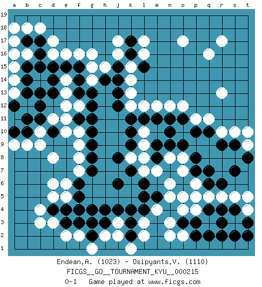Last move : 0-1 2024 January 29 20:28:4 [Event "FICGS__GO__TOURNAMENT_KYU__000215"] [Site "FICGS"] [Date "2023.10.21"] [Round "1"] [Black "Endean,Andrew"] [White "Osipyants,Vladimir"] [Result "0-1"] [Rating 1 "1023"] [Rating 2 "1110"] 1.q4 c4 2.e4 d6 3.d4 q16 4.q10 o17 5.k16 d17 6.d15 f16 7.d10 c3 8.k4 o4 9.o3 n3 10.p3 m4 11.h4 l3 12.k3 l2 13.k2 n2 14.m5 n5 15.l5 o7 16.q7 q5 17.r4 p4 18.q2 r13 19.c17 c18 20.c16 b18 21.c13 j17 22.k17 j16 23.j15 k15 24.l15 k14 25.j14 k13 26.j13 k12 27.j12 l16 28.k11 l17 29.k10 d8 30.f6 f7 31.g7 f8 32.g8 f9 33.g9 f10 34.g10 f12 35.f11 e11 36.g11 d11 37.c11 c10 38.b10 c9 39.c12 e12 40.g12 n12 41.n10 p11 42.p10 q11 43.o11 o12 44.n11 m7 45.l6 l7 46.k7 l9 47.k9 l10 48.l11 k8 49.j8 l8 50.j6 r5 51.s4 s5 52.p8 t4 53.t3 t5 54.s2 e2 55.f3 f2 56.g2 d3 57.f5 d5 58.e3 e5 59.f13 e13 60.f14 g3 61.f4 h2 62.h3 j2 63.g4 g1 64.g3 k1 65.l4 r10 66.r9 s10 67.s9 t9 68.t8 t10 69.s7 m12 70.m11 l12 71.n9 p6 72.q6 g15 73.f15 e16 74.e15 a15 75.b15 a16 76.b14 a14 77.b13 g14 78.g13 h15 79.h14 b9 80.a10 a9 81.b11 d16 82.p7 o8 83.o9 n8 84.o6 p5 85.m9 n6 86.m8 o5 87.r3 o2 88.p2 b16 89.b17 a17 90.c15 a13 91.a12 a18 92.d13 e14 93.d14 e10 94.r6 j3 95.j4 r17 96.r2 e6 97.t2 g16 0-1 Follow this game move after move (download)Extend one hand from the cutting points. (Anonymous) That's absurd. I love it. (Gregory House, House M.D.)