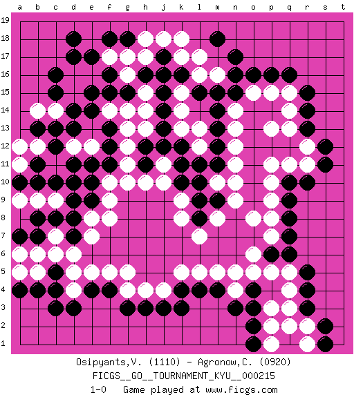 Last move : 1-0 2024 February 19 1:32:45 [Event "FICGS__GO__TOURNAMENT_KYU__000215"] [Site "FICGS"] [Date "2023.10.21"] [Round "1"] [Black "Osipyants,Vladimir"] [White "Agronow,Cosmo"] [Result "1-0"] [Rating 1 "1110"] [Rating 2 "0920"] 1.q16 d4 2.c16 q4 3.e17 p13 4.r14 r11 5.q8 o8 6.q6 p5 7.r10 q11 8.q10 p10 9.r4 q3 10.r3 r2 11.s2 q2 12.r5 q5 13.k3 k5 14.g3 g5 15.n3 n5 16.d10 e7 17.c3 b5 18.d3 f10 19.d13 g13 20.k16 k15 21.n15 n14 22.m14 n13 23.m15 g16 24.j15 k14 25.j14 l13 26.j13 k13 27.j12 j10 28.k11 m10 29.k10 k8 30.l9 k9 31.l10 j11 32.k12 m8 33.m9 n9 34.m11 n10 35.m13 n11 36.m12 n12 37.h16 h15 38.g15 h14 39.f16 g17 40.f15 g14 41.f12 g12 42.f11 g11 43.e10 f9 44.c8 c7 45.b8 l16 46.l15 k17 47.j16 l17 48.n17 o15 49.o16 p15 50.p16 q14 51.r15 q13 52.s12 r12 53.s11 p9 54.q9 p8 55.f4 f5 56.e4 e5 57.c4 d5 58.c5 c6 59.b4 b6 60.l4 l5 61.m4 m5 62.k4 j4 63.j3 h4 64.h3 g4 65.l8 l7 66.h11 h10 67.h12 h17 68.j17 j18 69.m18 k18 70.f18 m16 71.n16 g10 72.f13 f14 73.e14 h13 74.g18 h18 75.d8 e8 76.e9 f8 77.p6 o6 78.q7 p7 79.o4 o5 80.o2 p1 81.o1 p2 82.s1 r1 83.r13 p11 84.d7 d6 85.b7 n4 86.a4 a5 87.a7 l12 88.l11 q15 89.o3 p3 90.pass c9 91.c10 b9 92.b10 a9 93.d9 e12 94.e11 d12 95.c12 f17 96.d18 c11 97.b11 b12 98.c13 e16 99.e15 d16 100.d17 d15 101.c15 a11 102.d11 c14 103.d14 b14 104.b13 a12 105.a10 a6 106.pass 1-0 Follow this game move after move (download)The nature of a game comes from what is played, but it's the sensitivity to the possible and the impossible that gives it value. (Pierre Audouard) It is not true that people stop pursuing dreams because they grow old, they grow old because they stop pursuing dreams. (Gabriel Garcia Marquez)