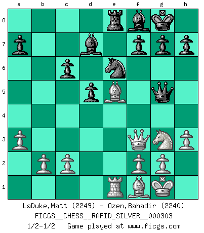 Last move : 1/2-1/2 2023 November 13 20:8:50 [Event "FICGS__CHESS__RAPID_SILVER__000303"] [Site "FICGS"] [Date "2023.10.22"] [Round "2"] [White "LaDuke,Matt"] [Black "Ozen,Bahadir"] [Result "1/2-1/2"] [WhiteElo "2249"] [BlackElo "2240"] 1.e4 e5 2.d4 exd4 3.Nf3 Nc6 4.Nxd4 Nf6 5.Nxc6 bxc6 6.Nc3 Bb4 7.Bd3 d5 8.exd5 cxd5 9.h3 O-O 10.O-O Re8 11.Qf3 c6 12.Bf4 Nd7 13.Rfe1 Nc5 14.Rxe8+ Qxe8 15.Bf1 Ne6 16.Re1 Qd8 17.Be5 Bf8 18.a3 Bd7 19.Ne2 Qg5 20.Ng3 Re8 1/2-1/2 Follow this game move after move (download)After a bad opening, there is hope for the middle game. After a bad middle game, there is hope for the endgame. But once you are in the endgame, the moment of truth has arrived. (Edmar Mednis) Schon mancher Spieler hat aufgegeben, um zu vermeiden, daß er eine Figur verliert. (Savielly Grigorievitsch Tartakower) El jugador táctico sabe que hacer cuando hay algo que hacer; mientras que el estratega sabe que hacer cuando no hay nada que hacer. (Gerald Abrahams) On peut tirer plus d'utilité d'une partie perdue que de 100 parties gagnées. (Capablanca) But they are useless. They can only give you answers. (Pablo Picasso, about computers)