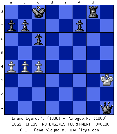 Last move : 0-1 2023 November 23 18:35:51 [Event "FICGS__CHESS__NO_ENGINES_TOURNAMENT__000130"] [Site "FICGS"] [Date "2023.10.26"] [Round "1"] [White "Brand Lyard,Paul"] [Black "Pirogov,Andrey Mikhaylovich"] [Result "0-1"] [WhiteElo "1386"] [BlackElo "1800"] 1.d4 d5 2.Nf3 c6 3.e3 Nf6 4.Nc3 Bf5 5.Ne5 Nbd7 6.Bd3 Bxd3 7.Qxd3 e6 8.Nxd7 Qxd7 9.O-O Be7 10.Re1 O-O-O 11.Re2 h5 12.h4 Nh7 13.e4 dxe4 14.Rxe4 g5 15.hxg5 Nxg5 16.Bxg5 Bxg5 17.f4 Bf6 18.Rae1 Bxd4+ 19.Rxd4 Qxd4+ 20.Qxd4 Rxd4 21.g3 h4 22.gxh4 Rxf4 23.b3 R8xh4 24.Ne2 Rhg4+ 25.Kh1 Rf6 26.Ng3 Rxg3 27.Kh2 Rg8 28.Re3 Rh6+ 29.Rh3 Rxh3+ 30.Kxh3 e5 31.Kh4 e4 32.c4 e3 33.a4 e2 34.b4 e1Q+ 35.Kh3 Qh1+ 0-1 Follow this game move after move (download)Good offense and good defense both begin with good development. (Bruce A. Moon) Die Neutralität betrachte ich als eine schwere Krankheit. (Viktor Kortschnoi) Bobby solo arroja las piezas y solas caen en las casillas correctas. (Miguel Najdorf ) La vie et les Echecs sont tous les deux une lutte constante. (Lasker) Nowadays, anyone who cannot speak English and is incapable of using the Internet is regarded as backward. (Al-Waleed bin Talal)