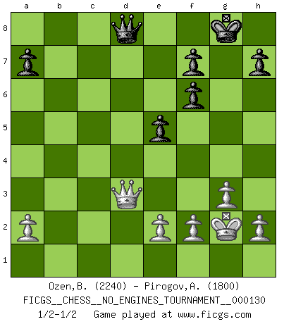 Last move : 1/2-1/2 2023 November 28 12:29:20 [Event "FICGS__CHESS__NO_ENGINES_TOURNAMENT__000130"] [Site "FICGS"] [Date "2023.10.26"] [Round "1"] [White "Ozen,Bahadir"] [Black "Pirogov,Andrey Mikhaylovich"] [Result "1/2-1/2"] [WhiteElo "2240"] [BlackElo "1800"] 1.Nf3 c5 2.g3 d5 3.Bg2 Nc6 4.d4 cxd4 5.Nxd4 e5 6.Nxc6 bxc6 7.c4 Be6 8.Nc3 Nf6 9.Bg5 Bb4 10.O-O Bxc3 11.bxc3 Qa5 12.cxd5 cxd5 13.c4 Rd8 14.Bxf6 gxf6 15.cxd5 Bxd5 16.Qc2 Bxg2 17.Kxg2 O-O 18.Rfd1 Rxd1 19.Rxd1 Rd8 20.Rxd8+ Qxd8 21.Qd3 1/2-1/2 Follow this game move after move (download)Up to this point White has been following well-known analysis. But now he makes a fatal error: he begins to use his own head. (Siegbert Tarrasch) Wenn ein Kopf und ein Buch zusammenstoßen und es klingt hohl, ist es denn allemal im Buche? (Georg Christoph Lichtenberg) Hay jugadores fuertes y personas amables y yo soy un jugador fuerte. (Bobby Fischer) Comme les marins qui ont mille raisons différentes d'aller en mer, les joueurs d'échecs en ont tout autant avant de s'installer devant une table et jouer... (Vincent Bertignac, philosophe) All art requires courage. (Anne Tucker)