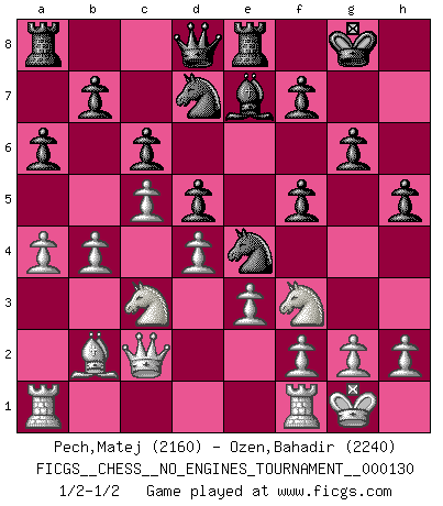 Last move : 1/2-1/2 2024 January 29 1:39:25 [Event "FICGS__CHESS__NO_ENGINES_TOURNAMENT__000130"] [Site "FICGS"] [Date "2023.10.26"] [Round "1"] [White "Pech,Matej"] [Black "Ozen,Bahadir"] [Result "1/2-1/2"] [WhiteElo "2160"] [BlackElo "2240"] 1.Nf3 d5 2.b3 Nf6 3.Bb2 Bf5 4.e3 e6 5.c4 h6 6.Be2 Be7 7.O-O O-O 8.Nc3 c6 9.d4 Nbd7 10.Bd3 a6 11.Bxf5 exf5 12.Qc2 g6 13.c5 h5 14.b4 Ne4 15.a4 Re8 1/2-1/2 Follow this game move after move (download)It's always better to sacrifice your opponent's men. (Savielly Tartakover) Versuche, dich von der Sklaverei der Eröffnungsvarianten zu befreien. Stattdessen soll man gewisse Typenpositionen erlernen, die man eingehend analysiert. (Aaron Nimzowitsch) En el Ajedrez, tal como en la vida, las bendiciones de hoy pueden ser el veneno del mañana. (Assaic) Si le désir cupide (et stupide) de gagner est une inépuisable source de souffrance, une combinaison brillante sur l'échiquier est une découverte : le coquelicot qui s'épanouit lorsque apparaît la Voie Lactée. (Arrabal) There is a very easy way to return from a casino with a small fortune : go there with a large one. (Jack Yelton)