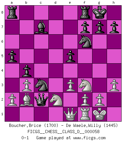 Last move : 0-1 2007 November 11 10:57:6 [Event "FICGS__CHESS__CLASS_D__000058"] [Site "FICGS"] [Date "2007.09.10"] [Round "1"] [White "Boucher,Brice"] [Black "De Waele,Willy"] [Result "0-1"] [WhiteElo "1700"] [BlackElo "1445"] 1.d4 d5 2.c4 c6 3.e3 Nf6 4.Nc3 e6 5.Nf3 Nbd7 6.Bd3 dxc4 7.Bxc4 b5 8.Bd3 Bb7 9.O-O a6 10.Bd2 c5 11.b3 Bd6 12.h3 cxd4 13.Nxd4 O-O 14.Rc1 Qe7 15.Rc2 Nc5 16.Be2 b4 17.Nb1 a5 18.Bf3 Nce4 19.Bc1 Qd7 20.Nd2 Nc3 21.Qe1 Bxf3 22.N4xf3 Bc7 23.Bb2 Qd3 24.Nd4 e5 25.N4f3 Qxc2 0-1 QGD Slav defense Kingside Castling by player White (move 9) Kingside Castling by player Black (move 13) Player Black won this chess game. Follow this game move after move (download)The tactician must know what to do whenever something needs doing; the strategist must know what to do when nothing needs doing. (Savielly Tartakover) Fischer machte Schach einfach zu einer aufregenden Sache, wann immer er sich ans Brett setzte. (Raymond Keene) El poder defensivo de una pieza clavada, solamente es imaginario. (Aaron Nimzovich) Ce n'est pas pour s'amuser qu'il joue aux échecs : il célèbre un culte. (Vladimir Nabokov) How many people work in NATO Headquarters ? - About half of them. (Dirk Stikker, NATO general secretary)
