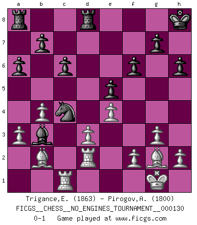 Last move : 0-1 2023 December 19 12:5:59 [Event "FICGS__CHESS__NO_ENGINES_TOURNAMENT__000130"] [Site "FICGS"] [Date "2023.10.26"] [Round "1"] [White "Trigance,Emile"] [Black "Pirogov,Andrey Mikhaylovich"] [Result "0-1"] [WhiteElo "1863"] [BlackElo "1800"] 1.c4 e5 2.Nc3 Nf6 3.Nf3 Nc6 4.g3 d5 5.cxd5 Nxd5 6.Bg2 Nb6 7.O-O Be7 8.d3 O-O 9.a3 Be6 10.b4 a6 11.Bb2 f6 12.Rc1 Qe8 13.Qc2 Kh8 14.Rfd1 Bg8 15.Ne4 Nd5 16.Nc5 Bxc5 17.Qxc5 Qe6 18.Nd2 Rfd8 19.Qc2 h6 20.Ne4 Nd4 21.Nc5 Nxc2 22.Nxe6 Bxe6 23.Rxc2 c6 24.e4 Nb6 25.Rcd2 Bb3 26.Rc1 Nc4 0-1 Follow this game move after move (download)The older I grow, the more I value Pawns. (Keres) Die Jungen erwarten, dass Opa einfach umfällt. Dann aber kann Opa fünf Stunden lang Schach spielen und die jungen Gegner an die Wand drücken. (Viktor Kortschnoi) Yo adoro todas la posiciones. Denme una partida posicional difícil, y la jugaré. Pero posiciones totalmente ganadas, no las tolero. (Hein Donner) Vous n'êtes pas toujours obligé de jouer le meilleur coup. Un coup doit être actif, entreprenant, correct et beau ! (David Bronstein) For to win one hundred victories in one hundred battles is not the acme of skill. To subdue the enemy without fighting is the acme of skill. (Sun Tzu)