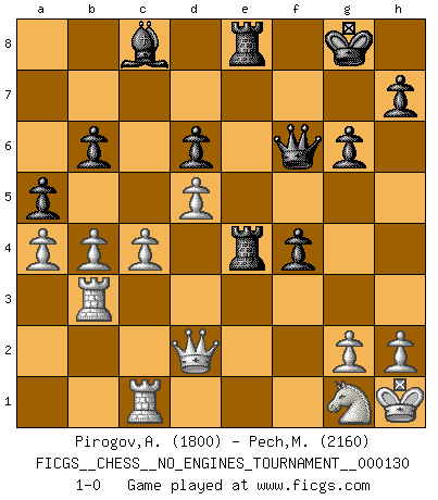 Last move : 1-0 2024 July 6 0:32:10 [Event "FICGS__CHESS__NO_ENGINES_TOURNAMENT__000130"] [Site "FICGS"] [Date "2023.10.26"] [Round "1"] [White "Pirogov,Andrey Mikhaylovich"] [Black "Pech,Matej"] [Result "1-0"] [WhiteElo "1800"] [BlackElo "2160"] 1.e4 c5 2.Nf3 Nc6 3.d4 cxd4 4.Nxd4 Nf6 5.Nc3 e5 6.Ndb5 d6 7.Nd5 Nxd5 8.exd5 Nb8 9.c4 Be7 10.Bd3 a6 11.Nc3 O-O 12.O-O f5 13.f4 Nd7 14.Kh1 g6 15.Bd2 Bf6 16.Rc1 Re8 17.a3 exf4 18.Bxf4 Be5 19.Bxe5 Nxe5 20.Be2 b6 21.a4 Qh4 22.b3 Rb8 23.Bf3 Rb7 24.Ne2 Nxf3 25.Rxf3 Rbe7 26.Ng1 a5 27.Qd2 Re4 28.Rh3 Qf6 29.b4 f4 30.Rb3 1-0 This chess game has been lost on time (started : 2023.10.26 18:54:19) Follow this game move after move (download)I like to say that Bobby Fischer was the greatest player ever. But what made Fischer a genius was his ability to blend an American freshness and pragmatism with Russian ideas about strategy. (Bruce Pandolfini) Habe Mut, dich deines eigenen Verstandes zu bedienen. (Immanuel Kant) Una mala movida nulifica cuarenta buenas. (Horowitz) Même si vous avez un bon coup à faire, regardez toujours s'il n'y en a pas un qui lui soit préférable. (Pedro Damiano) Do not put your faith in what statistics say until you have carefully considered what they do not say. (William W. Watt)