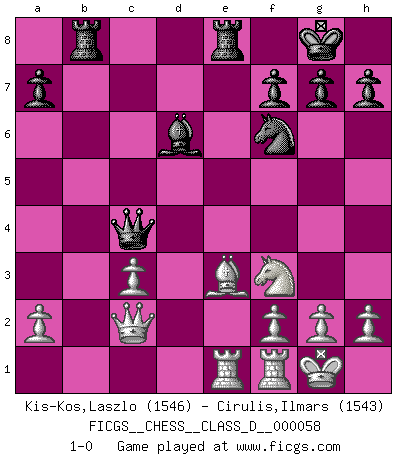 Last move : 1-0 2007 November 22 20:47:33 [Event "FICGS__CHESS__CLASS_D__000058"] [Site "FICGS"] [Date "2007.09.10"] [Round "1"] [White "Kis-Kos,Laszlo"] [Black "Cirulis,Ilmars"] [Result "1-0"] [WhiteElo "1546"] [BlackElo "1543"] 1.e4 e5 2.Nf3 Nc6 3.Bc4 Nf6 4.Ng5 d5 5.exd5 Na5 6.Bb5+ c6 7.dxc6 bxc6 8.Qf3 Be7 9.Bxc6+ Nxc6 10.Qxc6+ Bd7 11.Qa6 O-O 12.Nc3 Bf5 13.Qe2 Bxc2 14.d4 exd4 15.Qxc2 dxc3 16.bxc3 Bd6 17.O-O Re8 18.Nf3 Qc7 19.Bd2 Rab8 20.Rae1 Qc4 21.Be3 1-0 Two knights defense Kingside Castling by player Black (move 11) Kingside Castling by player White (move 17) Player White won this chess game. Follow this game move after move (download)When you absolutely don't know what to do anymore, it is time to panic. (John van der Wiel) Später, ... hatte ich zunehmend Erfolg in entscheidenden Partien. Vielleicht weil ich eine einfache Wahrheit erkannte: nicht nur ich hatte Angst, auch mein Gegner. (Mikhail Nekhemyevich Tal) En el Ajedrez, tal como en la vida, las bendiciones de hoy pueden ser el veneno del mañana. (Assaic) Des combinaisons [dans le jeu d'échecs] pareilles à des mélodies. Je crois entendre pour ainsi dire la musique des coups... (Vladimir Nabokov) Luck never gives; it only lends. (Swedish proverb)