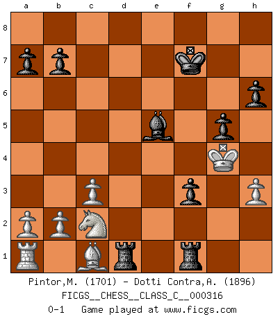Last move : 0-1 2023 December 12 23:15:31 [Event "FICGS__CHESS__CLASS_C__000316"] [Site "FICGS"] [Date "2023.10.31"] [Round "1"] [White "Pintor,Manuel"] [Black "Dotti Contra,Alessandro"] [Result "0-1"] [WhiteElo "1701"] [BlackElo "1896"] 1.e4 e5 2.f4 Nc6 3.Nf3 exf4 4.Bc4 h6 5.d4 g5 6.O-O d6 7.c3 Nf6 8.Nbd2 Qe7 9.e5 dxe5 10.Nxe5 Nxe5 11.dxe5 Ng4 12.Nf3 Bg7 13.e6 Qc5+ 14.Nd4 Qxc4 15.exf7+ Qxf7 16.Re1+ Kf8 17.h3 Ne5 18.Nb5 Bd7 19.Nxc7 Rd8 20.Qd6+ Qe7 21.Qxe7+ Kxe7 22.Nd5+ Kf7 23.Nb4 Bxh3 24.Rxe5 Bxe5 25.gxh3 Rd1+ 26.Kf2 Rhd8 27.Kf3 Rf1+ 28.Kg4 f3 29.Nc2 R8d1 0-1 Follow this game move after move (download)Fischer is an American Chess tragedy on par with Morphy and Pillsbury. (Mig Greengard) Du musst nicht gut spielen, es reicht, wenn du besser spielst als dein Gegner. (Anonymous) Todos los Maestros de Ajedrez fueron un día unos principiantes. (Chernev) Les Echecs sont affaire de jugement sensible. Savoir quand frapper et quand esquiver. (Fischer) Every vice is only an exaggeration of a necessary and virtuous function. (Ralph Waldo Emerson, Journals 1936)