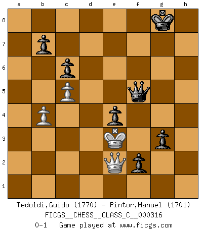 Last move : 0-1 2024 May 11 23:3:40 [Event "FICGS__CHESS__CLASS_C__000316"] [Site "FICGS"] [Date "2023.10.31"] [Round "1"] [White "Tedoldi,Guido"] [Black "Pintor,Manuel"] [Result "0-1"] [WhiteElo "1770"] [BlackElo "1701"] 1.c4 e5 2.Nc3 Bc5 3.d3 Nc6 4.Nf3 d6 5.h3 h6 6.e3 Nf6 7.a3 a5 8.Be2 O-O 9.O-O Ne7 10.b3 Be6 11.Qc2 c6 12.Rd1 Nf5 13.d4 exd4 14.exd4 Ba7 15.Be3 Nxe3 16.fxe3 d5 17.c5 Nh7 18.Rf1 Ng5 19.Ne5 Qc8 20.Bg4 f6 21.Bxe6+ Qxe6 22.h4 Ne4 23.Nxe4 fxe5 24.Ng3 e4 25.Ne2 Qg4 26.g3 Rf3 27.Qd2 Bb8 28.Rxf3 exf3 29.Nf4 Bxf4 30.exf4 Qxg3+ 31.Kf1 Re8 32.Qf2 Qxf4 33.Re1 Re4 34.Rxe4 dxe4 35.b4 axb4 36.axb4 Qc1+ 37.Qe1 Qc4+ 38.Kf2 Qxd4+ 39.Kg3 Qe5+ 40.Kf2 g5 41.hxg5 hxg5 42.Qe3 g4 43.Qe1 g3+ 44.Ke3 f2 45.Qe2 Qf5 0-1 Follow this game move after move (download)A thorough understanding of the typical mating continuations makes the most complicated sacrificial combinations leading up to them not only not difficult, but almost a matter of course. (Siegbert Tarrasch) Schach ist die gewalttätigste aller Sportarten. (Garry Kasparov) La vida es como el Ajedrez, con lucha, competición y eventos buenos y malos. (Benjamin Franklin) Le profane ne songe pas à la somme de jouissance dont il se prive, qui méconnaît ce jeu aux ressources aussi variées que passionnantes. (Jean-Marie Jeanton-Lamarche) Hold em is to stud what chess is to checkers. (Johnny Moss)