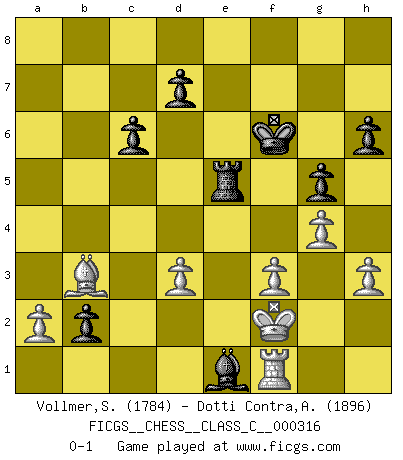 Last move : 0-1 2024 February 4 11:38:4 [Event "FICGS__CHESS__CLASS_C__000316"] [Site "FICGS"] [Date "2023.10.31"] [Round "1"] [White "Vollmer,Steve"] [Black "Dotti Contra,Alessandro"] [Result "0-1"] [WhiteElo "1784"] [BlackElo "1896"] 1.e4 e5 2.Nf3 Nc6 3.Bb5 Nf6 4.O-O Nxe4 5.Re1 Nd6 6.Ba4 Be7 7.Nxe5 Nxe5 8.Rxe5 O-O 9.d3 Bf6 10.Re1 b5 11.Bb3 Bb7 12.c3 a5 13.Bf4 Nf5 14.Nd2 a4 15.Bc2 Nh4 16.f3 a3 17.Rb1 b4 18.cxb4 axb2 19.Bb3 Bd4+ 20.Kh1 Qf6 21.Bg3 Nf5 22.Ne4 Bxe4 23.Rxe4 Nxg3+ 24.hxg3 Qg6 25.Rg4 Qh6+ 26.Rh4 Ra6 27.Qe1 g5 28.Rh3 Kh8 29.Qe4 Qg7 30.g4 Rh6 31.Kh2 Rxh3+ 32.gxh3 c6 33.Kg2 h6 34.Rd1 Rb8 35.Qe2 Qe5 36.Qxe5+ Bxe5 37.Bxf7 Rxb4 38.Bb3 Kg7 39.Kf2 Kf6 40.Ke2 Bc3 41.Rb1 Rb5 42.Rf1 Re5+ 43.Kf2 Be1+ 0-1 Follow this game move after move (download)When your house is on fire, you can't be bothered with the neighbors. Or, as we say in Chess, if your King is under attack you don't worry about losing a Pawn on the Queen's side. (Gary Kasparov) Ich trinke, ich rauche, ich spiele, ich liebe Frauen aber Fernschach ist ein Laster, das ich nicht habe. (Mikhail Nekhemyevich Tal) Para mi, el Ajedrez es la vida y cada partida es como una nueva vida. Todo jugador de Ajedrez suele vivir muchas vidas durante su vida. (Eduard Gufeld) Je crois qu'il existe des manières très spécifiques de jouer efficacement contre une machine. Evidemment, nous n'avons aucune chance en technique pure, parce que l'ordinateur calcule de manière parfaite. Mais lorsque nous faisons appel à notre cerveau, en utilisant l'intuition et la compréhension, alors nous restons beaucoup plus forts. (Anatoli Karpov) A good teacher is like a candle - it consumes itself to light the way for others. (Author unknown)