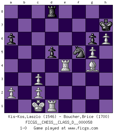 Last move : 1-0 2007 November 28 10:0:49 [Event "FICGS__CHESS__CLASS_D__000058"] [Site "FICGS"] [Date "2007.09.10"] [Round "1"] [White "Kis-Kos,Laszlo"] [Black "Boucher,Brice"] [Result "1-0"] [WhiteElo "1546"] [BlackElo "1700"] 1.e4 c5 2.Nf3 d6 3.d4 cxd4 4.Nxd4 Nf6 5.Nc3 a6 6.Be3 e6 7.Qd2 Qc7 8.f3 Be7 9.g4 h6 10.O-O-O O-O 11.h4 b5 12.g5 b4 13.Na4 Nh5 14.gxh6 g6 15.Qxb4 Nd7 16.Qc4 Qxc4 17.Bxc4 Bb7 18.Nxe6 fxe6 19.Bxe6+ Kh7 20.Bxd7 Rxf3 21.Bg5 Bxg5+ 22.hxg5 Bxe4 23.Rhe1 d5 24.Nc3 Rd8 25.Bg4 Rxc3 26.bxc3 Ng3 27.Re3 Nf5 28.Rxe4 1-0 Sicilian : Najdorf, Byrne (English) attack Queenside Castling by player White (move 10) Kingside Castling by player Black (move 10) Player White won this chess game. Follow this game move after move (download)I'd rather have a Pawn than a finger. (Reuben Fine) Das Schach ist nichts für kleine Geister, es beansprucht einen vollen Mann, der sich nicht sklavisch an das Überlieferte hält, sondern selbständig die Tiefen des Spiels zu ergründen sucht. (Wilhelm Steinitz) Cualquier cambio de material en una posición debe venir por medio de un mate, una captura o promoción de Peón. (Purdy) Avec des compensations pour le matériel en plus... (Anonyme) The intuitive mind is a sacred gift; the rational mind is a faithful servant. We have created a society that honors the servant but has forgotten the gift. (Albert Einstein)