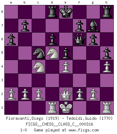 Last move : 1-0 2024 March 6 8:1:22 [Event "FICGS__CHESS__CLASS_C__000316"] [Site "FICGS"] [Date "2023.10.31"] [Round "1"] [White "Fioravanti,Diego"] [Black "Tedoldi,Guido"] [Result "1-0"] [WhiteElo "1919"] [BlackElo "1770"] 1.Nf3 c5 2.e4 d6 3.d4 cxd4 4.Nxd4 e5 5.Bb5+ Bd7 6.Bxd7+ Nxd7 7.Nf5 Nc5 8.Nc3 Nf6 9.Bg5 h6 10.Bxf6 Qxf6 11.Qe2 a6 12.Rd1 g6 13.Ne3 h5 14.h4 Bg7 15.Nc4 Rd8 16.Nd5 1-0 Follow this game move after move (download)A passed Pawn increases in strength as the number of pieces on the board diminishes. (Capablanca) Dass jemand wie Surab Asmaiparaschwili, der selbst Elopunkte gekauft hat , Vize-Präsident der Fide werden konnte, sagt schon einges über den Zustand dieser Organisation aus. (Joel Lautier) Uno no tiene que jugar muy bien, es suficiente jugar mejor que el oponente. (Siegbert Tarrasch) Aidez vos pièces, elles vous aideront. (Paul Morphy) We cannot be sure of having something to live for unless we are willing to die for it. (Ernesto Che Guevara)