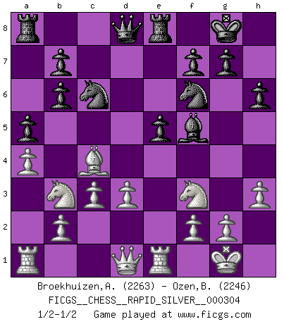 Last move : 1/2-1/2 2023 November 9 16:43:28 [Event "FICGS__CHESS__RAPID_SILVER__000304"] [Site "FICGS"] [Date "2023.11.03"] [Round "2"] [White "Broekhuizen,A. T. S."] [Black "Ozen,Bahadir"] [Result "1/2-1/2"] [WhiteElo "2263"] [BlackElo "2246"] 1.e4 e5 2.Nf3 Nc6 3.Bb5 Nf6 4.d3 Bc5 5.c3 O-O 6.O-O d5 7.exd5 Qxd5 8.Bc4 Qd8 9.Nbd2 a5 10.h3 h6 11.a4 Bf5 12.Nb3 Bb6 13.Be3 Re8 14.Bxb6 cxb6 15.Re1 1/2-1/2 Follow this game move after move (download)A good player is always lucky. (Jose Raul Capablanca) Über Kasparov: Es ist offensichtlich, daß er in einem totalitären Staat aufwuchs und deshalb zu diktatorischen Zügen neigt. (Viktor Kortschnoi) ¿Porque tengo que perder ante este idiota?. (Aron Nimzovich) Le pion, dans sa simplicité, marche droit devant lui, mais lorsqu'il prend, il le fait obliquement? Ainsi l'homme, tant qu'il reste pauvre, marche dans la droiture et vit honnêtement, mais lorsqu'il recherche les honneurs, il flatte, se parjure et, par les voies obliques, cherche une position supérieure sur l'échiquier du monde. (Jean de Galles) Creativity is allowing yourself to make mistakes. Art is knowing which ones to keep. (Scott Adams)