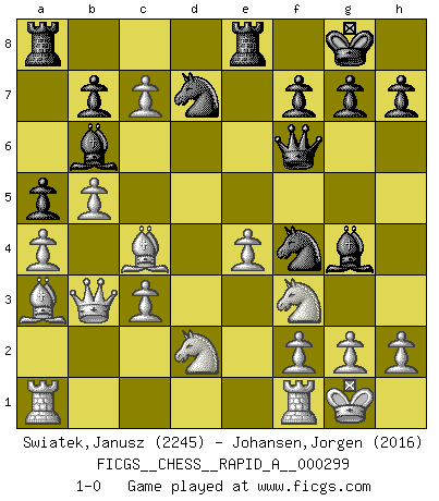 Last move : 1-0 2024 January 8 20:3:55 [Event "FICGS__CHESS__RAPID_A__000299"] [Site "FICGS"] [Date "2023.11.08"] [Round "1"] [White "Swiatek,Janusz"] [Black "Johansen,Jorgen"] [Result "1-0"] [WhiteElo "2245"] [BlackElo "2016"] 1.e4 e5 2.Nf3 Nc6 3.Bc4 Nf6 4.d3 Bc5 5.c3 d6 6.O-O O-O 7.b4 Bb6 8.a4 a5 9.b5 Ne7 10.Nbd2 Ng6 11.Ba3 Nf4 12.d4 Bg4 13.dxe5 Nd7 14.exd6 Qf6 15.dxc7 Rfe8 16.Qb3 1-0 This chess game has been lost on time (started : 2023.11.08 5:32:13) Follow this game move after move (download)Could we look into the head of a Chess player, we should see there a whole world of feelings, images, ideas, emotion and passion. (Alfred Binet) Matt entspricht nicht immer den Tatsachen. (Savielly Grigorievitsch Tartakower) No nos podemos resistir a la fascinación de un sacrificio ya que la pasión por los sacrificios es parte de la naturaleza de un jugador de Ajedrez. (Rudolf Spielman) Botvinnik disait en comparant les échecs à la musique: Il existe une science dont le but est l'étude de l'acoustique et des sons. Mais il y a aussi un art qui se sert de l'océan des sons : c'est la musique. De toute évidence, il en est de même pour la pensée. La logique est l'étude des lois de la réflexion et les échecs reflètent, en tant qu'art, le côté logique de la réflexion, sous la forme d'images artistiques... Extrait de Fischer - Spassky, Reykjavik 1972 par Alexander & F. Wyndham (Ed. Solar), p 37. Some people are so afraid to die that they never begin to live. (Henry Van Dyke)