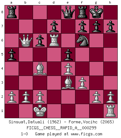Last move : 1-0 2024 January 17 17:52:7 [Event "FICGS__CHESS__RAPID_A__000299"] [Site "FICGS"] [Date "2023.11.08"] [Round "1"] [White "Sinsuat,Datuali"] [Black "Forme,Vocihc"] [Result "1-0"] [WhiteElo "1962"] [BlackElo "2065"] 1.e4 c5 2.Nf3 Nc6 3.d4 cxd4 4.Nxd4 Nf6 5.Nc3 a6 6.Be3 e5 7.Nxc6 bxc6 8.Bc4 Bb4 9.Qd3 O-O 10.O-O-O Bxc3 11.Qxc3 Bb7 12.f3 Rc8 13.Qb4 a5 14.Qxb7 Rb8 15.Qa7 Ra8 16.Qb6 Qe8 17.Rd6 1-0 Follow this game move after move (download)The tactician must know what to do whenever something needs doing; the strategist must know what to do when nothing needs doing. (Savielly Tartakover) Oft bringt ein stiller Zug das Erdbeben. (Richard Reti) El Jaque al descubierto es el bombardero del tablero. (Reuben Fine) Soyez une menace à chaque fois que vous vous asseyez pour jouer. (Ken Smith) Life is like a ten-speed bicycle: most of us have gears we never use. (Charles M. Schulz)