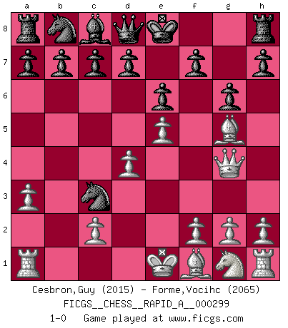 Last move : 1-0 2023 December 20 23:13:46 [Event "FICGS__CHESS__RAPID_A__000299"] [Site "FICGS"] [Date "2023.11.08"] [Round "1"] [White "Cesbron,Guy"] [Black "Forme,Vocihc"] [Result "1-0"] [WhiteElo "2015"] [BlackElo "2065"] 1.d4 Nf6 2.Nc3 e6 3.e4 Bb4 4.e5 Nd5 5.Qg4 g6 6.a3 Bxc3+ 7.bxc3 Nxc3 8.Bg5 1-0 Comment by player 2 : Vocihc Forme : Greetings and Luck... Follow this game move after move (download)In complicated positions, Bobby Fischer hardly had to be afraid of anybody. (Paul Keres) Im Blitz ist es einfacher mit einer Figur weniger anzugreifen, als sich mit einer Mehrfigur zu verteidigen. (Mikhail Nekhemyevich Tal) La caracteristica mas importante en la posición del Ajedrez es la actividad de las piezas. Esto es absolutamente fundamental en todas las fases del juego: Apertura, Juego Medio y especialmente Finales. La limitación primordial en la actividad de una pieza, es la estructuración de los Peones. (Michael Stean) Il n'y a pas eu de défaite parce que je ne crois pas que cet ordinateur ait jamais existé. IBM a triché en refusant d'imprimer les modes de recherche de la machine. C'est évident, pendant le match, des coups décisifs ont été joués par des êtres humains. Aujourd'hui, les meilleurs spécialistes en informatique ne peuvent toujours pas expliquer comment Deep-Blue a pu jouer contre la logique des ordinateurs. IBM a gagné une guerre de communication, mais ils sont incapables de prouver que l'ordinateur a gagné tout seul. (Garry Kasparov) There's no money in correspondence chess. (John Knudsen)