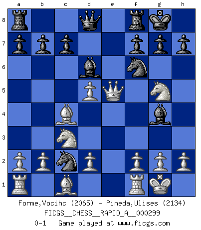 Last move : 0-1 2023 December 26 15:12:55 [Event "FICGS__CHESS__RAPID_A__000299"] [Site "FICGS"] [Date "2023.11.08"] [Round "1"] [White "Forme,Vocihc"] [Black "Pineda,Ulises"] [Result "0-1"] [WhiteElo "2065"] [BlackElo "2134"] 1.e4 e5 2.Nf3 Nc6 3.Bb5 Nf6 4.Nc3 Nd4 5.Bc4 Bc5 6.Ng5 O-O 7.O-O d5 8.exd5 Bg4 9.Qe1 Nxc2 10.Qxe5 Bd6 0-1 Follow this game move after move (download)Openings teach you openings. Endgames teach you chess ! (Stephan Gerzadowicz) Charakterschwächen offenbaren sich normalerweise während einer Schachpartie. (Garry Kasparov) No hay precio que sea tan grande por la cabellera del Rey enemigo. (Koblentz) Mon pion favori sur ma case favorite ! Bronstein en parlant d'un coup de pion en h5 quand il avait les Noirs. A journey of a thousand sites begins with a single click. (Author unknown)