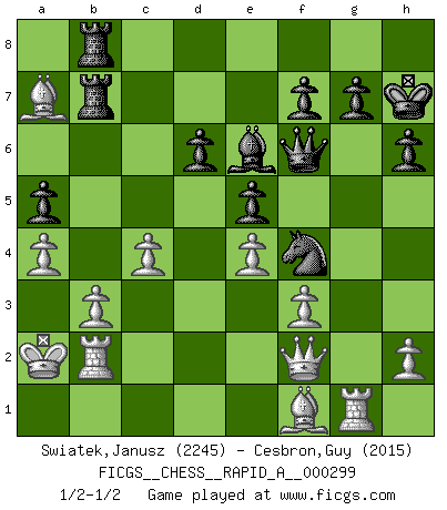 Last move : 1/2-1/2 2024 February 13 2:5:38 [Event "FICGS__CHESS__RAPID_A__000299"] [Site "FICGS"] [Date "2023.11.08"] [Round "1"] [White "Swiatek,Janusz"] [Black "Cesbron,Guy"] [Result "1/2-1/2"] [WhiteElo "2245"] [BlackElo "2015"] 1.e4 c5 2.Nf3 d6 3.d4 cxd4 4.Nxd4 Nf6 5.Nc3 a6 6.Be3 e5 7.Nb3 Be6 8.Qd2 Nbd7 9.f3 Be7 10.g4 b5 11.O-O-O O-O 12.g5 b4 13.gxf6 bxc3 14.Qxc3 Nxf6 15.Na5 Rc8 16.Nc6 Qd7 17.Nxe7+ Qxe7 18.Qa5 Rc6 19.b3 Nh5 20.Rd2 Qf6 21.Rf2 Nf4 22.Kb1 h6 23.c4 Rb8 24.Ka1 Qh4 25.Rg1 Kh7 26.Rb2 Rbc8 27.Qd2 Qf6 28.Rh1 Qh4 29.Rg1 Qf6 30.Qe1 Rb8 31.Qf2 a5 32.a4 Rc7 33.Ka2 Rcb7 34.Ba7 Ra8 35.Be3 Rab8 36.Ba7 1/2-1/2 Follow this game move after move (download)A big shock; the best chess player in history has passed away. (Lajos Portisch, about Bobby Fischer's death) Karpov ist ein Museumsstück. (Garry Kasparov) Cada Peón es potencialmente una Reina. (James Mason) Karpov est une pièce de musée. (Garry Kasparov) If you ain't just a little scared when you enter a casino, you are either very rich or you haven't studied the games enough. (Pappy)