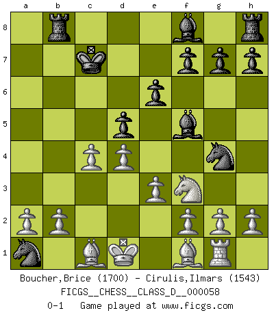 Last move : 0-1 2007 November 22 17:55:57 [Event "FICGS__CHESS__CLASS_D__000058"] [Site "FICGS"] [Date "2007.09.10"] [Round "1"] [White "Boucher,Brice"] [Black "Cirulis,Ilmars"] [Result "0-1"] [WhiteElo "1700"] [BlackElo "1543"] 1.d4 d5 2.c4 Nc6 3.Nc3 Nf6 4.e3 Bf5 5.Qb3 e6 6.Qxb7 Nb4 7.Nb5 Rb8 8.Nxc7+ Kd7 9.Qxa7 Nc2+ 10.Kd1 Qxc7 11.Qxc7+ Kxc7 12.Nf3 Ng4 13.Rg1 Nxa1 0-1 QGD : Chigorin defense Player Black won this chess game. Follow this game move after move (download)I give 98 percent of my mental energy to Chess. Others give only 2 percent. (Bobby Fischer) Wie bekannt hörte Morphy 1859 auf, Schach zu spielen. Seine Enttäuschung galt nicht so sehr dem Schach, wie den Schachspielern. (Robert James Fischer) Debemos de asegurarnos de que el Ajedrez no se convierta en un lenguaje muerto, muy interesante, pero tan solo para un grupo muy pequeño. (Sytze Faber) Mais n'est-ce pas déjà le limiter injurieusement que d'appeler les échecs un jeu? N'est-ce pas aussi une science, un art, ou quelque chose qui, comme le cercueil de Mahomet entre ciel et terre, est suspendu entre l'un et l'autre, et qui réunit un nombre incroyable de contraires ? (Stefan Zweig) Computers have lots of memory but no imagination. (Anonymous)