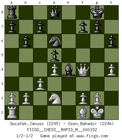 Last move : 1/2-1/2 2023 December 22 7:54:41 [Event "FICGS__CHESS__RAPID_M__000152"] [Site "FICGS"] [Date "2023.11.11"] [Round "1"] [White "Swiatek,Janusz"] [Black "Ozen,Bahadir"] [Result "1/2-1/2"] [WhiteElo "2245"] [BlackElo "2246"] 1.e4 e5 2.Nf3 Nc6 3.Bb5 Nf6 4.O-O Nxe4 5.Re1 Nd6 6.Nxe5 Be7 7.Bf1 Nxe5 8.Rxe5 O-O 9.d4 Bf6 10.Re1 Re8 11.c3 Rxe1 12.Qxe1 Ne8 13.Bf4 d5 14.Nd2 Bf5 15.Nb3 Nd6 16.Qe3 b6 17.Qf3 Be4 18.Qg3 Bh4 19.Qe3 h6 20.Nd2 Bg5 21.h4 Bxf4 22.Qxf4 1/2-1/2 Follow this game move after move (download)If your opponent offers you a draw, try to work out why he thinks he's worse off. (Nigel Short) Ein typischer, sehr verbreiteter Gedankenschädling ist der, daß der betreffende Amateur von der Annanhme ausgeht, daß jeder einzelne Zug etwas zu leisten habe. (Aaron Nimzowitsch) No hay precio que sea tan grande por la cabellera del Rey enemigo. (Koblentz) A chaque perte on perd un peu de soi. (Joël Lautier) Computers make it easier to do a lot of things, but most of the things they make it easier to do don't need to be done. (Andy Rooney)