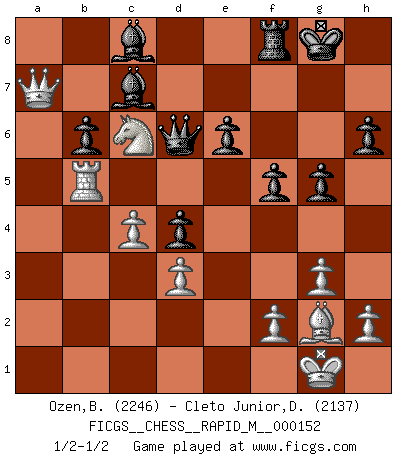 Last move : 1/2-1/2 2023 November 30 6:42:51 [Event "FICGS__CHESS__RAPID_M__000152"] [Site "FICGS"] [Date "2023.11.11"] [Round "1"] [White "Ozen,Bahadir"] [Black "Cleto Junior,Dirceu"] [Result "1/2-1/2"] [WhiteElo "2246"] [BlackElo "2137"] 1.Nf3 d5 2.g3 Nf6 3.Bg2 c5 4.O-O e6 5.c4 d4 6.e3 Nc6 7.d3 Bd6 8.exd4 cxd4 9.Bg5 h6 10.Bxf6 Qxf6 11.Nbd2 Qe7 12.a3 a5 13.Ne4 Bc7 14.b4 axb4 15.axb4 Rxa1 16.Qxa1 f5 17.Nc5 O-O 18.Rb1 Nxb4 19.Rxb4 Qxc5 20.Rb5 Qd6 21.Ne5 b6 22.Qa7 g5 23.Nc6 Rf7 24.Qa8 Rf8 25.Qa7 Rf7 26.Qa8 Rf8 27.Qa7 1/2-1/2 Follow this game move after move (download)By the beauty of his games, the clarity of his play, and the brilliance of his ideas, Fischer made himself an artist of the same stature as Brahms, Rembrandt, and Shakespeare. (David Levy) Ohne Leiden bildet sich kein Charakter. (Ernst Freiherr von Feuchtersleben) Nunca antes ha habido un jugador de Ajedrez con tal conocimiento a fondo de las complejidades del juego y una inmensa voluntad absolutamente indomable de ganar. Yo pienso que Fischer es el jugador mas grande que jamás haya existido. (Lisa Lane) On a dit que l'homme se distingue de l'animal par le fait qu'il achète plus de livres qu'il ne peut en lire. Je voudrais suggérer qu'inclure à la liste des livres quelques livres d'échecs rendrait la distinction manifeste. (Edward Lasker) Think like a man of action, act like a man of thought. (Henri Louis Bergson)