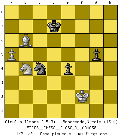 Last move : 1/2-1/2 2008 May 20 17:43:41 [Event "FICGS__CHESS__CLASS_D__000058"] [Site "FICGS"] [Date "2007.09.10"] [Round "1"] [White "Cirulis,Ilmars"] [Black "Broccardo,Nicola"] [Result "1/2-1/2"] [WhiteElo "1543"] [BlackElo "1514"] 1.e4 d6 2.d4 Nf6 3.Nc3 g6 4.Nf3 Bg7 5.Be2 O-O 6.O-O c6 7.Bf4 Bg4 8.h3 Bxf3 9.Bxf3 Nbd7 10.e5 dxe5 11.dxe5 Ne8 12.Re1 Nc7 13.Bg4 e6 14.Qd4 Qe7 15.Qd6 Qd8 16.Rad1 Nb6 17.Ne4 Nbd5 18.Qxd8 Raxd8 19.Bg5 Rb8 20.c4 Nb6 21.Nd6 Nc8 22.f4 b5 23.b3 bxc4 24.bxc4 c5 25.Ne4 Na6 26.Re3 h6 27.Bh4 Rb4 28.Ra3 Rxc4 29.Nd2 Rxf4 30.Rxa6 Bxe5 31.Bg3 Rxg4 32.Bxe5 Rb4 33.Bc3 Rb6 34.Ra5 Rd6 35.Rxc5 Ne7 36.Rc7 Rc8 37.Rxc8+ Nxc8 38.Rc1 Rc6 39.Bb2 Rxc1+ 40.Bxc1 f6 41.Nc4 h5 42.g4 hxg4 43.hxg4 Kf7 44.g5 Nb6 45.Nd6+ Ke7 46.Nb5 a6 47.Ba3+ Kd8 48.Nd4 e5 49.Ne6+ Ke8 50.gxf6 Kf7 51.Nc5 Nc4 52.Bc1 Kxf6 53.Nxa6 e4 54.Kf2 Kf5 55.a4 Ke5 56.Be3 Nb2 57.a5 Nc4 58.Bb6 Kd6 59.Nb4 Kd7 60.Kf1 g5 61.Kf2 1/2-1/2 Pirc : Classical system, 5.Be2 Kingside Castling by player Black (move 5) Kingside Castling by player White (move 6) 10 pieces endgame at move 50 : White KBNPP , Black KNPPP WHITE : King + 1 Bishop 1 Knight 2 Pawns BLACK : King + 1 Knight 3 Pawns 9 pieces endgame at move 52 : White KBNP , Black KNPPP WHITE : King + 1 Bishop 1 Knight 1 Pawn BLACK : King + 1 Knight 3 Pawns 8 pieces endgame at move 53 : White KBNP , Black KNPP WHITE : King + 1 Bishop 1 Knight 1 Pawn BLACK : King + 1 Knight 2 Pawns This chess game ended in a draw. Follow this game move after move (download)Chess is really ninety nine percent calculation. (Soltis) Habe Mut, dich deines eigenen Verstandes zu bedienen. (Immanuel Kant) Una mala movida nulifica cuarenta buenas. (Horowitz) Que feriez-vous si vous étiez en train de jouer aux échecs et que la fin du monde arrive ? Je continuerais à jouer. (Saint Borromée) 98% of all statistics are made up. (Author unknown)