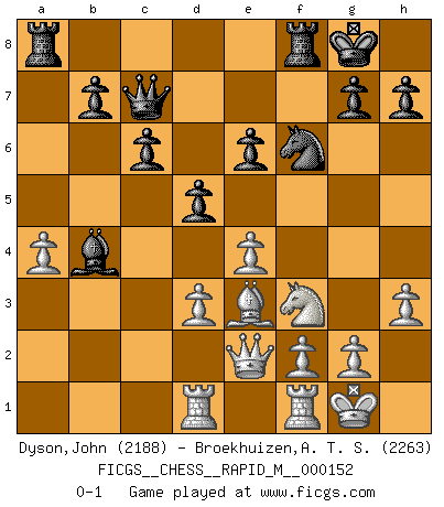 Last move : 0-1 2024 February 8 19:47:30 [Event "FICGS__CHESS__RAPID_M__000152"] [Site "FICGS"] [Date "2023.11.11"] [Round "1"] [White "Dyson,John"] [Black "Broekhuizen,A. T. S."] [Result "0-1"] [WhiteElo "2188"] [BlackElo "2263"] 1.e4 e5 2.Nf3 Nc6 3.Bc4 Nf6 4.d3 Be7 5.O-O O-O 6.Nc3 d6 7.a4 Bg4 8.h3 Bxf3 9.Qxf3 Nd4 10.Qd1 c6 11.Ba2 Ne6 12.Be3 a5 13.Qf3 Kh8 14.Rad1 Qc7 15.Qe2 Rae8 16.Bxe6 fxe6 17.Nb1 Kg8 18.Nd2 d5 19.c3 Bd6 20.Nf3 Qf7 21.b4 axb4 22.cxb4 Bxb4 23.Nxe5 Qc7 24.Nf3 Ra8 0-1 This chess game has been lost on time (started : 2023.11.11 14:41:2) Follow this game move after move (download)Let the perfectionist play postal. (Yasser Seirawan) Der Freibauer hat für mich eine Seele, genau wie der Mensch, Wünsche, die unerkannt in ihm schlummern, und Befürchtungen, von deren Existenz er selbst kaum ahnt. (Aaron Nimzowitsch) No puedes jugar al Ajedrez si eres de corazón noble. (Proverbio Francés) Aidez vos pièces, elles vous aideront. (Paul Morphy) The only sure thing about luck is that it will change. (Wilson Mizner)