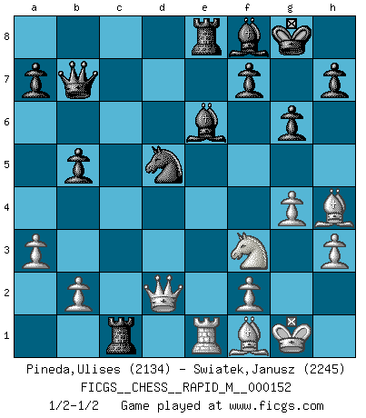 Last move : 1/2-1/2 2024 January 30 22:0:51 [Event "FICGS__CHESS__RAPID_M__000152"] [Site "FICGS"] [Date "2023.11.11"] [Round "1"] [White "Pineda,Ulises"] [Black "Swiatek,Janusz"] [Result "1/2-1/2"] [WhiteElo "2134"] [BlackElo "2245"] 1.d4 d5 2.c4 e6 3.Nc3 Nf6 4.cxd5 exd5 5.Nf3 c6 6.Qb3 Qb6 7.Qc2 g6 8.e4 dxe4 9.Bg5 Nbd7 10.Nxe4 Bb4+ 11.Nc3 O-O 12.Be2 Re8 13.O-O Nd5 14.Bd3 N7f6 15.h3 Bf8 16.a3 Be6 17.Rfe1 Qc7 18.Bh4 Bh6 19.Rad1 Rac8 20.Na4 b6 21.Ne5 Qb7 22.Bf1 Nd7 23.g4 Bf8 24.Nf3 c5 25.dxc5 b5 26.Rc1 Nxc5 27.Nxc5 Rxc5 28.Qd2 Rxc1 1/2-1/2 Follow this game move after move (download)Fischer is the strongest player in the world. In fact, the strongest player who ever lived. (Larry Evans) Sie führen leise Selbstgespräche, schlürfen lautstark ihre Getränke, schmatzen hörbar beim Essen, blasen ihrem Gegenüber Rauch in die Augen, niesen ihm ins Gesicht, starren ihn unverwandt an, bis er sich unter ihren Blicken windet, rutschen ständig auf ihrem Stuhl hin und her, rülpsen und bohren in der Nase. (Anonymous) El Jaque al descubierto es el bombardero del tablero. (Reuben Fine) Les Echecs sont affaire de jugement sensible. Savoir quand frapper et quand esquiver. (Fischer) The production of too many useful things results in too many useless people. (Karl Marx)