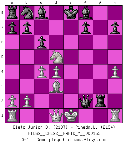 Last move : 0-1 2023 December 26 5:29:3 [Event "FICGS__CHESS__RAPID_M__000152"] [Site "FICGS"] [Date "2023.11.11"] [Round "1"] [White "Cleto Junior,Dirceu"] [Black "Pineda,Ulises"] [Result "0-1"] [WhiteElo "2137"] [BlackElo "2134"] 1.e4 e5 2.f4 exf4 3.Nf3 g5 4.h4 g4 5.Ne5 Nf6 6.Nxg4 Nxe4 7.d3 Ng3 8.Bxf4 Qe7+ 9.Be2 Rg8 10.Bxg3 Rxg4 11.Bf2 Rxg2 12.Nc3 d5 13.Nxd5 Qe5 14.c4 c6 15.d4 Qf5 16.Bd3 Qxf2+ 0-1 Follow this game move after move (download)One bad move nullifies forty good ones. (Horowitz) Sitze auf Deine Hände. (Siegbert Tarrasch) Los Peones son nacidos libres, y aún así, se encuentran por doquier encadenados. (Rick Kennedy) Les échecs, c'est la lutte contre l'erreur. (Johannes Zukertort) Horse racing is animated roulette. (Roger Kahn)