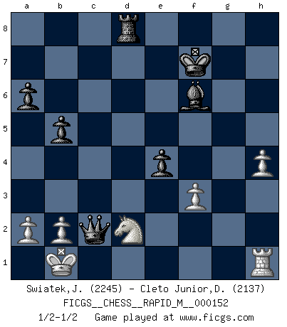 Last move : 1/2-1/2 2023 December 28 3:18:43 [Event "FICGS__CHESS__RAPID_M__000152"] [Site "FICGS"] [Date "2023.11.11"] [Round "1"] [White "Swiatek,Janusz"] [Black "Cleto Junior,Dirceu"] [Result "1/2-1/2"] [WhiteElo "2245"] [BlackElo "2137"] 1.e4 c5 2.Nf3 d6 3.d4 cxd4 4.Nxd4 Nf6 5.Nc3 a6 6.Be3 e5 7.Nb3 Be6 8.Qd2 Nbd7 9.f3 h5 10.Nd5 Bxd5 11.exd5 g6 12.O-O-O Nb6 13.Kb1 Nbxd5 14.Bg5 Be7 15.c4 Nb6 16.Na5 O-O 17.h4 d5 18.g4 dxc4 19.Qc2 Qc7 20.Bxf6 Bxf6 21.gxh5 Rfd8 22.Rxd8+ Rxd8 23.hxg6 e4 24.gxf7+ Kxf7 25.Bxc4+ Nxc4 26.Nxc4 b5 27.Nd2 Qxc2+ 1/2-1/2 Follow this game move after move (download)Via the squares on the chessboard, the Indians explain the movement of time and the age, the higher influences which control the world and the ties which link Chess with the human soul. (Al-Masudi) Ich hatte Zahnschmerzen im ersten Spiel. In der zweiten Partie tat mir der Kopf weh. In der dritten war es eine Rheuma-Attacke und während der vierten fühlte ich mich nicht gut. Und in der fünften? Nun, man muss doch nicht jedes Spiel gewinnen, oder? (Savielly Grigorievitsch Tartakower) Cuando tu casa esta en llamas, no puedes ser molestado por tus vecinos. O, como decinos en Ajedrez, si tu Rey esta bajo ataque, no te preocupa perder un Peón del lado de la Reina. (Gary Kasparov) Ce qui caractérise les parties de combat, c'est que si le défenseur a constamment de difficiles problèmes à résoudre, l'attaquant doit chercher sans relâche de nouvelles possibilités d'attaque. (Koblentz) Employ the attack like tactic of defense. (Chinese proverb)