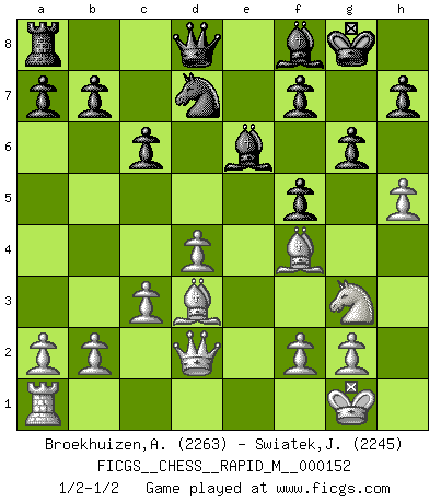 Last move : 1/2-1/2 2023 December 16 22:12:3 [Event "FICGS__CHESS__RAPID_M__000152"] [Site "FICGS"] [Date "2023.11.11"] [Round "1"] [White "Broekhuizen,A. T. S."] [Black "Swiatek,Janusz"] [Result "1/2-1/2"] [WhiteElo "2263"] [BlackElo "2245"] 1.e4 c6 2.d4 d5 3.Nc3 dxe4 4.Nxe4 Nf6 5.Nxf6+ exf6 6.c3 Bf5 7.Ne2 Bd6 8.Ng3 Be6 9.Bd3 O-O 10.O-O g6 11.Ne4 Be7 12.Bh6 Re8 13.h4 Nd7 14.Re1 Bd5 15.Ng3 Bf8 16.Bf4 Rxe1+ 17.Qxe1 Be6 18.h5 f5 19.Qd2 1/2-1/2 Follow this game move after move (download)I know people who have all the will in the world, but still can't play good Chess. (Bobby Fischer) Ich habe die besten Aussichten, den ersten Preis zu gewinnen - denn jeder muss gegen Steinitz spielen, nur ich nicht! (Wilhelm Steinitz) Aquel que toma al Peón de Caballo de la Reina, se pasará la noche a dormir en la calle. (Anónimo) Toutes choses étant égales, c'est la conviction qui gagne. Alliée à une volonté de vaincre, elle sert de détonateur, suscite des idées, disperse les doutes et aide à penser clairement. (Robert Fischer) I find television to be very educating. Every time somebody turns on the set, I go in the other room and read a book. (Groucho Marx)