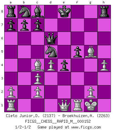 Last move : 1/2-1/2 2023 November 29 18:4:22 [Event "FICGS__CHESS__RAPID_M__000152"] [Site "FICGS"] [Date "2023.11.11"] [Round "1"] [White "Cleto Junior,Dirceu"] [Black "Broekhuizen,A. T. S."] [Result "1/2-1/2"] [WhiteElo "2137"] [BlackElo "2263"] 1.e4 e5 2.f4 exf4 3.Nf3 g5 4.h4 d5 5.d4 dxe4 6.Nxg5 Nf6 7.Nc3 Bb4 8.Bxf4 h6 9.Bc4 hxg5 10.Bxg5 Bxc3+ 11.bxc3 Qd6 12.O-O Nd5 13.Qe1 f5 1/2-1/2 Follow this game move after move (download)Pawn endings are to Chess what putting is to golf. (Cecil Purdy) Sicherlich können nur Meister einen Stil haben. Daß ein nicht-Meister auch nur ein einziges Mal in seinem Leben eine Partie folgerecht durchführte, habe ich niemals bemerkt. (Emanuel Lasker) Un entendimiento a fondo de las continuaciones típicas del mate, hace de las combinaciones de sacrificio mas complicadas conducirlas a ellas no solo sin dificultad, sino casi de una manera natural. (Siegbert Tarrasch) Je ne crois pas en la psychologie, je crois aux bons coups. (Robert Fischer) We need strong personalities and only one world champion to attract sponsors. (Anatoly Karpov)
