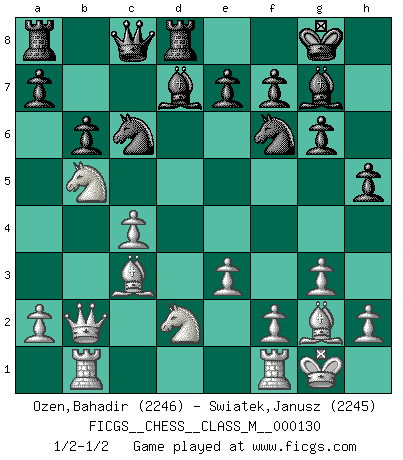 Last move : 1/2-1/2 2023 December 23 10:8:11 [Event "FICGS__CHESS__CLASS_M__000130"] [Site "FICGS"] [Date "2023.11.15"] [Round "1"] [White "Ozen,Bahadir"] [Black "Swiatek,Janusz"] [Result "1/2-1/2"] [WhiteElo "2246"] [BlackElo "2245"] 1.Nf3 d5 2.g3 g6 3.Bg2 Nf6 4.O-O Bg7 5.d4 c6 6.b3 O-O 7.c4 dxc4 8.bxc4 c5 9.Bb2 cxd4 10.Nxd4 Qb6 11.Qc1 Bd7 12.Nd2 Nc6 13.e3 Qc7 14.Bc3 h5 15.Qb2 Rfd8 16.Rab1 b6 17.Nb5 Qc8 18.Nd6 Qc7 19.Nb5 Qc8 1/2-1/2 Follow this game move after move (download)I have never in my life played the French Defence, which is the dullest of all openings. (Wilhelm Steinitz) Das typische an einem Großmeister ist, daß er eine gewonnene Position schnell und schmerzlos gewinnt. (Irving Chernev) El Ajedrez era la lengua materna de Capablanca. (Reti) Nous sommes les pions de la mystérieuse partie d'Echecs jouée par Dieu. Il nous déplace, nous arrête, nous pousse encore, puis nous lance un à un dans la boîte du Néant. Epitaphe sur la tombe de David Janowsky (1868-1927). In God we trust, all others we virus scan. (Anonymous)