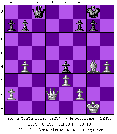 Last move : 1/2-1/2 2023 December 28 8:28:31 [Event "FICGS__CHESS__CLASS_M__000130"] [Site "FICGS"] [Date "2023.11.15"] [Round "1"] [White "Gounant,Stanislas"] [Black "Ambos,Ilmar"] [Result "1/2-1/2"] [WhiteElo "2234"] [BlackElo "2249"] 1.b3 e5 2.Bb2 Nc6 3.e3 Nf6 4.Nf3 e4 5.Nd4 Nxd4 6.Bxd4 Be7 7.c4 O-O 8.Nc3 c5 9.Be5 d6 10.Bg3 Bf5 11.Bh4 Re8 12.Be2 d5 13.Bxf6 Bxf6 14.cxd5 Qd6 15.Bg4 Bg6 16.Be2 Rad8 17.Qc2 Bxc3 18.dxc3 Qxd5 19.Rd1 Qg5 20.Rxd8 Rxd8 21.O-O Bf5 22.b4 cxb4 23.cxb4 h5 24.Rd1 Rc8 25.Qb2 h4 26.Rd5 Qg6 27.Qd2 Kh7 28.h3 Bxh3 29.Rh5+ Kg8 30.g3 Qc6 31.Rc5 Qe6 32.Rxc8+ Qxc8 33.gxh4 Bg4 34.Bxg4 1/2-1/2 Follow this game move after move (download)Chess is like war on a board. (Bobby Fischer) Du kannst im Schach nur gut werden, wenn du das Spiel liebst. (Robert James Fischer) Observen a Garry Kasparov. Después de una derrota, invariablemente el gana la próxima partida. Prácticamente hace pedazos a su siguiente oponente. Eso es algo que tenemos que aprender a lograr. (Maurice Ashley) Horreur, mais aussi harmonie suprême : qu'y avait-il en effet au monde en dehors des échecs ? Le brouillard, l'inconnu, le non-être... (Vladimir Nabokov) Fame, I have already. Now I need the money. (an elderly Steinitz)