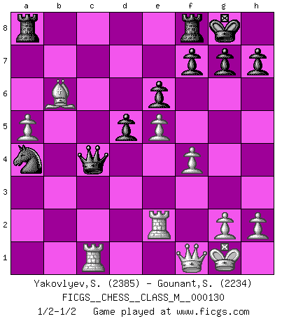 Last move : 1/2-1/2 2024 January 6 17:44:47 [Event "FICGS__CHESS__CLASS_M__000130"] [Site "FICGS"] [Date "2023.11.15"] [Round "1"] [White "Yakovlyev,Sergiy"] [Black "Gounant,Stanislas"] [Result "1/2-1/2"] [WhiteElo "2385"] [BlackElo "2234"] 1.d4 e6 2.e4 d5 3.Nc3 Nf6 4.e5 Nfd7 5.f4 c5 6.Nf3 Nc6 7.Be3 cxd4 8.Nxd4 Qb6 9.Na4 Qa5+ 10.Nc3 Qb6 11.a3 Bc5 12.Ncb5 a6 13.b4 axb5 14.bxc5 Qxc5 15.Qd3 Nxd4 16.Bxd4 Qc6 17.Qb3 O-O 18.Bxb5 Qc7 19.O-O Nc5 20.Qb4 b6 21.Rfb1 Ba6 22.a4 Bxb5 23.Qxb5 Ne4 24.Bxb6 Qxc2 25.a5 Nc3 26.Rb2 Qe4 27.Qf1 Na4 28.Re2 Qb4 29.Rb1 Qc4 30.Rc1 1/2-1/2 Follow this game move after move (download)The essence of Chess is thinking about what Chess is. (David Bronstein) Schach ist ein Kampf gegen den Fehler. (Johannes Herrman Zukertort) Tu no necesitas jugar muy bien, únicamente ayudar a tu oponenet a que juegue muy mal. (Genrikh Chepukaitis) On est toujours la mazette de quelqu'un d'autre. (Anonyme) Always two there are. No more no less. A master, and an apprentice. (Master Yoda in Star Wars ep.1)