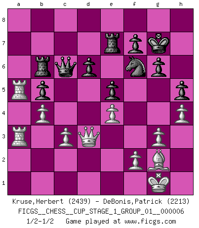 Last move : 1/2-1/2 2024 February 22 20:8:42 [Event "FICGS__CHESS__CUP_STAGE_1_GROUP_01__000006"] [Site "FICGS"] [Date "2023.11.17"] [Round "2"] [White "Kruse,Herbert"] [Black "DeBonis,Patrick"] [Result "1/2-1/2"] [WhiteElo "2439"] [BlackElo "2213"] 1.e4 e5 2.Nf3 Nc6 3.Bb5 Nf6 4.d3 Bc5 5.c3 d5 6.Nbd2 dxe4 7.dxe4 Qe7 8.O-O O-O 9.h3 h6 10.b4 Bd6 11.a3 a5 12.Rb1 Rd8 13.Re1 Nh5 14.Bf1 Be6 15.Qc2 Nf4 16.Nc4 Qf6 17.Bxf4 Qxf4 18.Nh2 Qg5 19.g3 axb4 20.axb4 Nb8 21.Rbd1 Qe7 22.Ng4 Nd7 23.Nge3 Nf6 24.Nf5 Qf8 25.Qc1 Rab8 26.Qe3 b5 27.Ncxd6 cxd6 28.Qf3 Bxf5 29.Qxf5 Qe7 30.Ra1 Rb6 31.Qf3 Rdb8 32.Ra5 g6 33.Rea1 Kg7 34.Ra7 R8b7 35.R7a5 h5 36.h4 Qd7 37.Qd3 Qc6 38.Bg2 Rc7 39.R1a3 Re7 1/2-1/2 Follow this game move after move (download)The tactician must know what to do whenever something needs doing; the strategist must know what to do when nothing needs doing. (Savielly Tartakover) Dein Körper muss in Topform sein. Dein Schach verfällt, wenn dein Körper verfällt. Der Körper kann nicht vom Geist getrennt werden. (Robert James Fischer) La partida mas dura de ganar es una partida ganada. (Emanuel Lasker) Les Echecs mettent en conflit, non pas deux intelligences, mais deux volontés. (Lasker) Memory... is the diary that we all carry with us. (Oscar Wilde, The Importance of Being Earnest)