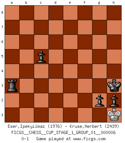 Last move : 0-1 2024 March 25 14:14:59 [Event "FICGS__CHESS__CUP_STAGE_1_GROUP_01__000006"] [Site "FICGS"] [Date "2023.11.17"] [Round "1"] [White "Eser,Ipekyilmaz"] [Black "Kruse,Herbert"] [Result "0-1"] [WhiteElo "1976"] [BlackElo "2439"] 1.a3 d5 2.a4 e5 3.Na3 Nc6 4.e3 Nf6 5.Bb5 Bd6 6.Kf1 a6 7.Bxc6+ bxc6 8.h3 O-O 9.d3 c5 10.Ne2 e4 11.Kg1 Rb8 12.b3 exd3 13.cxd3 Re8 14.Bb2 Be6 15.Nf4 Bxf4 16.exf4 d4 17.Nc4 Bxc4 18.dxc4 Ne4 19.h4 Qf6 20.Rh3 Qxf4 21.Qc2 Rb6 22.Rd1 Rf6 23.Rf1 Qd2 24.Qxd2 Nxd2 25.Rd1 Re2 26.Bc1 R6xf2 27.Bxd2 Rxg2+ 28.Kf1 Rgf2+ 29.Kg1 Rxd2 30.Rxd2 Rxd2 31.Rf3 g6 32.Rf6 Rb2 33.Rxa6 d3 34.Ra8+ Kg7 35.Rd8 Rxb3 36.Kf1 Ra3 37.a5 Rxa5 38.Rxd3 Ra4 39.h5 Rxc4 40.Rd5 Rf4+ 41.Kg1 Rf5 42.Rd7 Rxh5 43.Rxc7 Rf5 44.Kh2 h5 45.Kh1 g5 46.Rd7 h4 47.Kh2 g4 48.Kg2 Kh6 49.Rd8 Rf3 50.Rg8 f5 51.Re8 h3+ 52.Kh2 Kg5 53.Re2 Kh4 54.Kg1 g3 55.Ra2 h2+ 56.Kg2 Kg4 57.Rd2 f4 58.Rb2 Ra3 59.Rb1 f3+ 60.Kh1 Kh3 61.Rg1 g2+ 62.Rxg2 fxg2+ 0-1 Follow this game move after move (download)My style is somewhere between that of Tal and Petrosian. (Reshevsky) Die Partien sind immer verschieden, die Interviews immer die gleichen. (Garry Kasparov) Cuando tu casa esta en llamas, no puedes ser molestado por tus vecinos. O, como decinos en Ajedrez, si tu Rey esta bajo ataque, no te preocupa perder un Peón del lado de la Reina. (Gary Kasparov) Nous vivons dans un monde échiquéen : chaque jour qui passe est un défi à relever. (Philosophe Sasha) Everybody lies. (Gregory House, House M.D.)