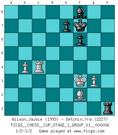 Last move : 1/2-1/2 2024 January 31 3:30:49 [Event "FICGS__CHESS__CUP_STAGE_1_GROUP_01__000006"] [Site "FICGS"] [Date "2023.11.17"] [Round "1"] [White "Wilson,Jaimie"] [Black "Detchin,Yra"] [Result "1/2-1/2"] [WhiteElo "1993"] [BlackElo "2227"] 1.c4 c6 2.Nf3 Nf6 3.g3 d5 4.Bg2 dxc4 5.O-O Nbd7 6.Na3 Nb6 7.Qc2 Be6 8.Ne5 h5 9.Naxc4 Nxc4 10.Nxc4 h4 11.Ne5 hxg3 12.hxg3 Qd4 13.Qc3 Qd6 14.d4 Rd8 15.Qc2 Qxd4 16.Bf4 Nd7 17.Rfd1 Qc5 18.Qa4 Nxe5 19.Rxd8+ Kxd8 20.b4 Qc4 21.Qa5+ Ke8 22.Qxe5 f6 23.Qb8+ Kf7 24.Qxb7 g5 25.Be3 Bd5 26.Rc1 Qxa2 27.Bxa7 Bxg2 28.Kxg2 Qd5+ 29.f3 Qd2 30.Qxc6 Qxe2+ 31.Bf2 g4 32.Qc4+ Qxc4 33.Rxc4 gxf3+ 34.Kxf3 Rh1 1/2-1/2 Follow this game move after move (download)Your body has to be in top condition. Your Chess deteriorates as your body does. You can't separate body from mind. (Bobby Fischer) Es ist im Leben wie im Schachspiel. Wir entwerfen einen Plan, dieser bleibt jedoch bedingt durch das, was im Schachspiel dem Gegner, im Leben dem Schicksal zu tun belieben wird. (Arthur Schopenhauer) En un gambito tu regalas un Peón por el bién de tomar un juego perdido. (Samuel Standige Boden) Celui qui prend des risques peut perdre, celui qui n'en prend pas perd toujours. (Xavier Tartacover) There are three kinds of lies: lies, damned lies and statistics. (Mark Twain)