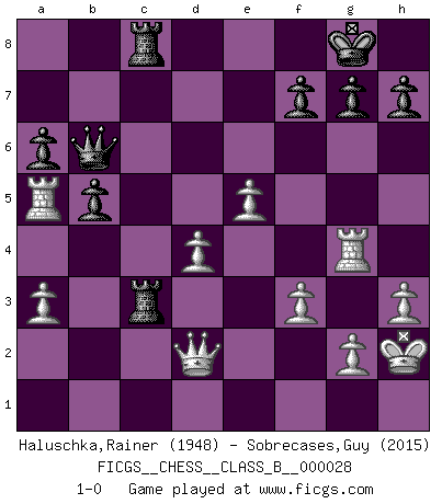 Last move : 1-0 2008 August 28 19:32:22 [Event "FICGS__CHESS__CLASS_B__000028"] [Site "FICGS"] [Date "2007.09.10"] [Round "1"] [White "Haluschka,Rainer"] [Black "Sobrecases,Guy"] [Result "1-0"] [WhiteElo "1948"] [BlackElo "2015"] 1.d4 d5 2.c4 Nc6 3.cxd5 Qxd5 4.e3 e5 5.Nc3 Bb4 6.a3 Bxc3+ 7.bxc3 exd4 8.cxd4 Nf6 9.Nf3 Bf5 10.Be2 Be4 11.O-O O-O 12.Bb2 Rad8 13.Rc1 Rfe8 14.Rc5 Qd6 15.Nd2 Bd5 16.Bd3 Re7 17.Qe2 Qe6 18.Re1 Rde8 19.Qd1 Qd6 20.Nc4 Qe6 21.Ne5 Nxe5 22.dxe5 Ne4 23.Ra5 a6 24.f3 Bb3 25.Bc2 Rd7 26.Bd4 Bxc2 27.Qxc2 c5 28.Qxe4 cxd4 29.exd4 b5 30.Qe3 Qb6 31.Qd2 Red8 32.Re4 Rc7 33.h3 Rdc8 34.Kh2 Rc3 35.Rg4 1-0 This chess game has been lost on time (started : 2007.09.10 17:4:30) QGD : Chigorin defense Kingside Castling by player White (move 11) Kingside Castling by player Black (move 11) Player White won this chess game. Follow this game move after move (download)During a Chess competition a Chessmaster should be a combination of a beast of prey and a monk. (Alexander Alekhine) Ich glaube, ich kenne inzwischen die Gründe für mein Versagen: schachliche Charakterfehler. Ich war nie ein Wunderkind und in meiner gesamten menschlichen Entwicklung immer zu langsam. (Viktor Kortschnoi) Si no le temes a Spassky, entonces elimino el elemento del dinero. (Jim Slater) Les Echecs représentent une sphère d'idées créatrices basée sur la volonté des deux protagonistes. (Smyslov) No enterprise is more likely to succeed than one concealed from the enemy until it is ripe for execution. (Niccolo Machiavelli)