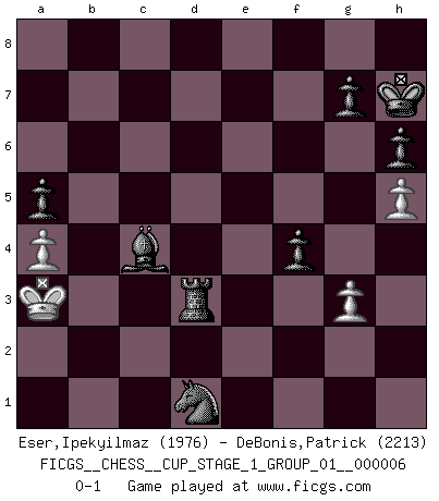Last move : 0-1 2024 June 13 14:14:32 [Event "FICGS__CHESS__CUP_STAGE_1_GROUP_01__000006"] [Site "FICGS"] [Date "2023.11.17"] [Round "1"] [White "Eser,Ipekyilmaz"] [Black "DeBonis,Patrick"] [Result "0-1"] [WhiteElo "1976"] [BlackElo "2213"] 1.a3 c5 2.a4 Nc6 3.Na3 d5 4.e3 e5 5.Bb5 a6 6.Bxc6+ bxc6 7.d3 Bd6 8.e4 Ne7 9.b3 O-O 10.h3 f5 11.Kf1 h6 12.exd5 cxd5 13.Bb2 e4 14.h4 Bb7 15.h5 Qd7 16.c3 f4 17.dxe4 dxe4 18.Nc4 Nd5 19.Rh3 Bc7 20.Ba3 Qc6 21.Nf3 exf3 22.Qxf3 Rae8 23.Kg1 Rf5 24.Nd2 Nxc3 25.Qxc6 Ne2+ 26.Kf1 Bxc6 27.Bb2 Rd5 28.Nf3 Bd7 29.Rh1 Ba5 30.Rh2 Bb4 31.Rh4 a5 32.Rh1 Bc8 33.Rh4 Kh7 34.Rh3 Ba6 35.Be5 R8xe5 36.Nxe5 Rxe5 37.Rh4 Bc3 38.Rd1 Bd4 39.Rh3 Nc3 40.R1d3 Ne4 41.Ke2 Nxf2 42.Kd2 Nxh3 43.Kc2 Nf2 44.Rd2 Re4 45.b4 cxb4 46.Kb1 b3 47.Rxd4 Rxd4 48.Kb2 Nd1+ 49.Kxb3 Rd2 50.Ka3 Bc4 51.g3 Rd3+ 0-1 Follow this game move after move (download)The defensive power of a pinned piece is only imaginary. (Aaron Nimzovich) Ich bin Weltmeister und muß mit niemandem irgend etwas diskutieren. (Viswanathan Anand) Los tropiezos estan todos ahí en el tablero, esperando que se cometan. (Savielly Tartakover) Les sacrifices démontrent seulement que quelqu'un a gaffé. (Savielly Tartacover) They say poker is a zero-sum game. It must be, because every time I play my sum ends up zero. (Max Shapiro)