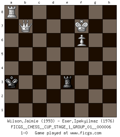 Last move : 1-0 2024 June 9 17:58:39 [Event "FICGS__CHESS__CUP_STAGE_1_GROUP_01__000006"] [Site "FICGS"] [Date "2023.11.17"] [Round "1"] [White "Wilson,Jaimie"] [Black "Eser,Ipekyilmaz"] [Result "1-0"] [WhiteElo "1993"] [BlackElo "1976"] 1.c4 f6 2.d4 f5 3.Nc3 Nf6 4.Nf3 e6 5.g3 Bb4 6.Bg2 a6 7.O-O Bxc3 8.bxc3 Kf8 9.Rb1 Kg8 10.d5 d6 11.dxe6 Nc6 12.Nh4 Bxe6 13.Rxb7 Qd7 14.c5 Na5 15.Rxc7 Qxc7 16.Bxa8 Qxc5 17.Be3 Qc8 18.Bg2 Kf7 19.Bd4 Re8 20.e4 fxe4 21.Bxf6 Kxf6 22.Bxe4 g6 23.Qxd6 Qd8 24.Qxa6 Kg7 25.Bd3 Qd5 26.Ng2 Bf7 27.Ne3 Qc5 28.Bb5 Re5 29.Qxa5 Qxb5 30.Qxb5 Rxb5 31.Ra1 Rc5 32.c4 Kf6 33.a4 Ra5 34.f4 h6 35.Kf2 Ke7 36.Ke2 Kd6 37.Kd3 Kc5 38.Kc3 h5 39.h4 Be6 40.Nd5 Bxd5 41.cxd5 Kxd5 42.Kb4 Ra8 43.a5 Kc6 44.a6 Ra7 45.Kc4 Kc7 46.Kd5 Kc8 47.Ke6 Kb8 48.Kf6 Rc7 49.Kxg6 Rc3 50.Kxh5 Rxg3 51.f5 Rf3 52.Kg6 Rg3+ 53.Kf7 Ka7 54.Rh1 Kxa6 55.h5 Rd3 56.h6 Rd7+ 57.Kg6 Rd6+ 58.f6 Rd3 59.h7 Rg3+ 60.Kf7 Rb3 61.h8Q Rb7+ 62.Kg6 Rb2 63.Qa8+ Kb5 64.Rc1 Kb4 65.Rc8 Rb3 66.Kf7 Re3 67.Qb7+ Ka3 68.Ra8+ 1-0 This chess game has been lost on time (started : 2023.11.17 20:37:29) Follow this game move after move (download)He who takes the Queen's Knight's Pawn will sleep in the streets. (Anonymous) Die Neutralität betrachte ich als eine schwere Krankheit. (Viktor Kortschnoi) Es muy difícil jugar en contra de la teoría de Einstein. - en su primera derrota en contra de Fischer (Mikhail Tal) Mais l'homme est une créature légère et illogique : semblable au joueur d'échecs, il n'aime que le processus du but à atteindre, non le but lui-même. (Dostoïevsky) Fortune favours the audacious. (Desiderius Erasmus)