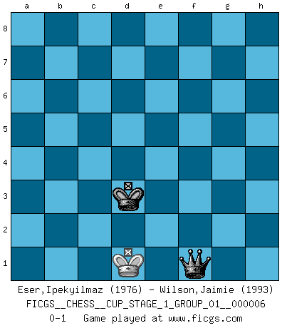 Last move : 0-1 2024 June 2 4:28:3 [Event "FICGS__CHESS__CUP_STAGE_1_GROUP_01__000006"] [Site "FICGS"] [Date "2023.11.17"] [Round "2"] [White "Eser,Ipekyilmaz"] [Black "Wilson,Jaimie"] [Result "0-1"] [WhiteElo "1976"] [BlackElo "1993"] 1.a3 e5 2.a4 d5 3.Na3 Nf6 4.d3 Nc6 5.Bg5 Bc5 6.e3 h6 7.Bxf6 Qxf6 8.Be2 O-O 9.c3 d4 10.Nc2 Rd8 11.cxd4 exd4 12.e4 Qg6 13.Kf1 f5 14.exf5 Bxf5 15.Nf3 Qf7 16.Rc1 Rf8 17.Ne3 dxe3 18.Rxc5 exf2 19.Kxf2 Qf6 20.Re1 Nd4 21.Re5 Rae8 22.Rxe8 Rxe8 23.Bf1 Rf8 24.Kg1 Bg4 25.Be2 Re8 26.Bf1 Rxe1 27.Qxe1 Qxf3 28.gxf3 Nxf3+ 29.Kf2 Nxe1 30.Kxe1 a5 31.Bg2 b6 32.Kd2 Bd7 33.Bd5+ Kf8 34.b3 Ke7 35.d4 Be6 36.Bc4 Bxc4 37.bxc4 Ke6 38.h3 Kf5 39.Ke3 g5 40.Kf3 h5 41.Ke3 g4 42.hxg4+ hxg4 43.c5 bxc5 44.dxc5 c6 45.Kf2 Ke4 46.Kg3 Kd4 47.Kxg4 Kxc5 48.Kf4 Kb4 49.Ke4 Kxa4 50.Ke5 Kb3 51.Kd6 a4 52.Kxc6 a3 53.Kd5 a2 54.Ke5 a1Q+ 55.Kf5 Qg7 56.Kf4 Qf6+ 57.Ke4 Kc3 58.Ke3 Qf5 59.Ke2 Qf4 60.Ke1 Kd3 61.Kd1 Qf1+ 0-1 This chess game has been lost on time (started : 2023.11.17 20:37:29) Follow this game move after move (download)Is Bobby Fischer quite sane ? (Salo Flohr) Im Spitzenschach von heute geht es nur um Vorbereitung, um tiefgründige, sorgfältige Eröffnungsvorbereitung. (Nigel Short) La mitad de las variaciones que son calculadas en una partida de torneo, resultan ser completamente superfluas. Desafortunadamente, nadie sabe por adelantado cual mitad. (Jan Tinman) La victoire dans une partie d'Echecs appartient la plupart du temps à celui qui voit un peu plus loin que l'adversaire. (Lasker) The only sure thing about luck is that it will change. (Wilson Mizner)