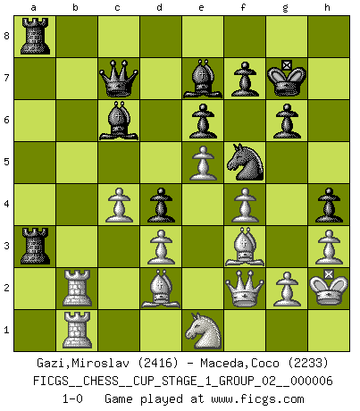 Last move : 1-0 2024 March 7 19:9:58 [Event "FICGS__CHESS__CUP_STAGE_1_GROUP_02__000006"] [Site "FICGS"] [Date "2023.11.17"] [Round "1"] [White "Gazi,Miroslav"] [Black "Maceda,Coco"] [Result "1-0"] [WhiteElo "2416"] [BlackElo "2233"] 1.e4 c5 2.Nc3 Nc6 3.f4 g6 4.Nf3 Bg7 5.a4 a6 6.d3 Rb8 7.Be2 b5 8.axb5 axb5 9.O-O b4 10.Nd5 e6 11.Ne3 Nge7 12.Qe1 O-O 13.c3 Na5 14.Bd1 d5 15.e5 Ba6 16.Bc2 h5 17.cxb4 cxb4 18.b3 Ra8 19.Rf2 d4 20.Nc4 Nxc4 21.bxc4 Nf5 22.Bd1 Bb7 23.Rb1 Bc6 24.Qxb4 Re8 25.Qe1 Bf8 26.h3 h4 27.Rfb2 Ba3 28.Rd2 Be7 29.Qf2 Qc7 30.Rdb2 Ra5 31.Bd2 Ra3 32.Ne1 Rea8 33.Bf3 Kg7 34.Kh2 1-0 This chess game has been lost on time (started : 2023.11.17 20:37:31) Follow this game move after move (download)Who is your opponent tonight, tonight I am playing against the Black pieces. (Akiba Rubinstein) Ich habe Putins Aufstieg an die Macht beobachtet und seine Politik, die demokratischen Institutionen meines Landes zu zerstören. (Garry Kasparov) Las Aperturas te enseñan aperturas. ¡Los Finales te enseñan Ajedrez!. (Stephan Gerzadowicz) Le jeu d'échecs fait naître et fortifie en nous plusieurs qualités précieuses dans le cours de l'existence, telles que la prévoyance, la circonspection, la prudence, et la persévérance. (Benjamin Franklin - 1783, la morale des échecs) I can't decide which is riskier; taking crazy risks, or taking advice on crazy risks from a crazy risk taker. (Gregory House in House M.D.)