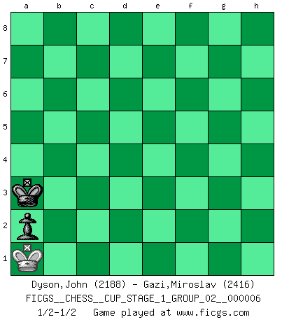 Last move : 1/2-1/2 2024 October 4 12:26:26 [Event "FICGS__CHESS__CUP_STAGE_1_GROUP_02__000006"] [Site "FICGS"] [Date "2023.11.17"] [Round "1"] [White "Dyson,John"] [Black "Gazi,Miroslav"] [Result "1/2-1/2"] [WhiteElo "2188"] [BlackElo "2416"] 1.e4 c5 2.Nc3 Nc6 3.Bc4 e6 4.Nf3 Nf6 5.Bb5 Qc7 6.Bxc6 Qxc6 7.Qe2 Be7 8.O-O O-O 9.d4 cxd4 10.Nxd4 Qb6 11.Rd1 d6 12.a4 Bd7 13.a5 Qa6 14.f3 Rfc8 15.Be3 Qxe2 16.Ndxe2 a6 17.h3 Rc4 18.Rd2 Rac8 19.Rad1 Be8 20.Rd4 R4c7 21.R4d2 Nd7 22.f4 h5 23.Bf2 Kf8 24.Rd3 Rc4 25.Rf3 Nf6 26.Nd4 Bc6 27.Re3 g6 28.Kh2 e5 29.fxe5 dxe5 30.Nxc6 R8xc6 31.Bg3 Bd6 32.Rf1 Nd7 33.Ref3 f6 34.Nd5 Be7 35.Re3 Rxc2 36.Rb3 Nc5 37.Rb4 Re2 38.Bxe5 Rxe4 39.Nxe7 Kxe7 40.Bd4 Nd7 41.Rd1 Rc7 42.Kg3 Ke6 43.Rd3 g5 44.Rc3 h4+ 45.Kh2 Rxc3 46.bxc3 Re2 47.Rxb7 Ra2 48.Bb6 Ne5 49.Kg1 Kf5 50.c4 Rc2 51.Bd4 Nc6 52.Bb6 Rc1+ 53.Kf2 Rxc4 54.Rc7 Ne5 55.Rxc4 Nxc4 56.Bd8 Ke6 57.Ke2 Ne5 58.Bb6 Kf5 59.Ke3 Nc6 60.Kd3 Kf4 61.Ke2 Ke4 62.Kf2 f5 63.g3 hxg3+ 64.Kxg3 Nd4 65.Kf2 Ne6 66.Kg3 Kd3 67.Kf3 Kc4 68.Kg3 Kd5 69.Kf3 Nd4+ 70.Kg3 Ke4 71.Kf2 f4 72.Bd8 Ne6 73.Bb6 Ng7 74.Bc7 Nh5 75.Bb6 Nf6 76.Bd8 Kf5 77.Kf3 Ne4 78.Ke2 Nc5 79.Kf2 Nd3+ 80.Ke2 Nb2 81.Bc7 Nc4 82.Bb6 Nd6 83.Bd8 Nb7 84.Bc7 Nc5 85.Kf3 Nb3 86.Kf2 Nd4 87.Kg2 Ke4 88.Bb6 Ne6 89.Ba7 Kd5 90.Kf2 Nd4 91.Bb6 Nc6 92.Kf3 Ne5+ 93.Ke2 Kc6 94.Bd8 Nf7 95.Bb6 Kb5 96.Kf3 Ne5+ 97.Ke4 Nc4 98.Bd8 Nd6+ 99.Kf3 Nf7 100.Bb6 Kc6 101.Ke4 Nd6+ 102.Kd4 Kd7 103.Kd5 Nc8 104.Bd4 Ne7+ 105.Ke4 Ke6 106.h4 gxh4 107.Kxf4 Nf5 108.Bf2 h3 109.Kf3 Kd5 110.Bb6 Kc6 111.Kf2 Nd6 112.Kg3 Nc4 113.Bd8 Kb5 114.Kxh3 Nxa5 115.Kg2 Nc4 116.Kf3 Nb6 117.Bxb6 Kxb6 118.Ke2 Kb5 119.Kd3 Kb4 120.Kd2 Kb3 121.Kc1 Kc3 122.Kb1 Kb3 123.Kc1 a5 124.Kb1 a4 125.Ka1 a3 126.Kb1 a2+ 127.Ka1 Ka3 1/2-1/2 Follow this game move after move (download)The passed Pawn is a criminal, who should be kept under lock and key. Mild measures, such as police surveillance, are not sufficient. (Aaron Nimzovich) Der vorletzte Fehler gewinnt. (Savielly Grigorievitsch Tartakower) Yo creo que el Ajedrez posee una magia que es también una ayuda en la edad avanzada. Una rodilla reumática es olvidada durante una partida de Ajedrez y otros eventos pueden parecer algo sin importancia comparada a una catástrofe en el tablero de Ajedrez. (Vlastimil Hort) A ce moment-là, je menaçais de comprendre la position ! (Clément L'Heureux) Watch your thoughts; they become words. Watch your words; they become actions. Watch your actions; they become habits. Watch your habits; they become character. Watch your character; it becomes your destiny. (Frank Outlaw)