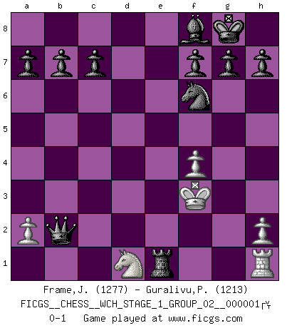 Last move : 0-1 2006 July 8 22:13:38 [Event "FICGS__CHESS__WCH_STAGE_1_GROUP_02__000001 "] [Site "FICGS"] [Date "2006.07.01"] [Round "1"] [White "Frame,Jeremy"] [Black "Guralivu,Paul-Iosif"] [Result "0-1"] [WhiteElo "1277"] [BlackElo "1213"] 1.e4 e6 2.d4 d5 3.exd5 exd5 4.Nf3 Nf6 5.c4 Bg4 6.Bd3 dxc4 7.Bxc4 Bxf3 8.gxf3 Be7 9.Be3 O-O 10.Nc3 Nc6 11.Ke2 Re8 12.Qg1 Bf8 13.f4 Nxd4+ 14.Kf1 Nc2 15.Rd1 Nxe3+ 16.fxe3 Qe7 17.Rd3 Rad8 18.Rxd8 Qxd8 19.Kg2 Qd2+ 20.Be2 Rxe3 21.Qe1 Qxb2 22.Nd1 Rxe2+ 23.Kf3 Rxe1 0-1 French : Exchange variation Kingside Castling by player Black (move 9) Player Black won this chess game. Follow this game move after move (download)Modern Chess is too much concerned with things like Pawn structure. Forget it, Checkmate ends the game. (Nigel Short) Wenn Schach ein enormer Dschungel ist, der seine Myriaden von Geheimnissen nicht preisgeben will, dann sind Computer die Kettensägen einer gewaltigen ökologisch unsensiblen Nutzholzfirma. (Nigel Short) Alekhine es un poeta que crea un trabajo de arte de algo que raramente inspiraría a otra persona a mandar una tarjeta postal. (Max Euwe) Le génie consiste à savoir transgresser les règles au moment opportun. (Teichmann) Big Chess is a place for big hallucinations. (Thibault de Vassal)